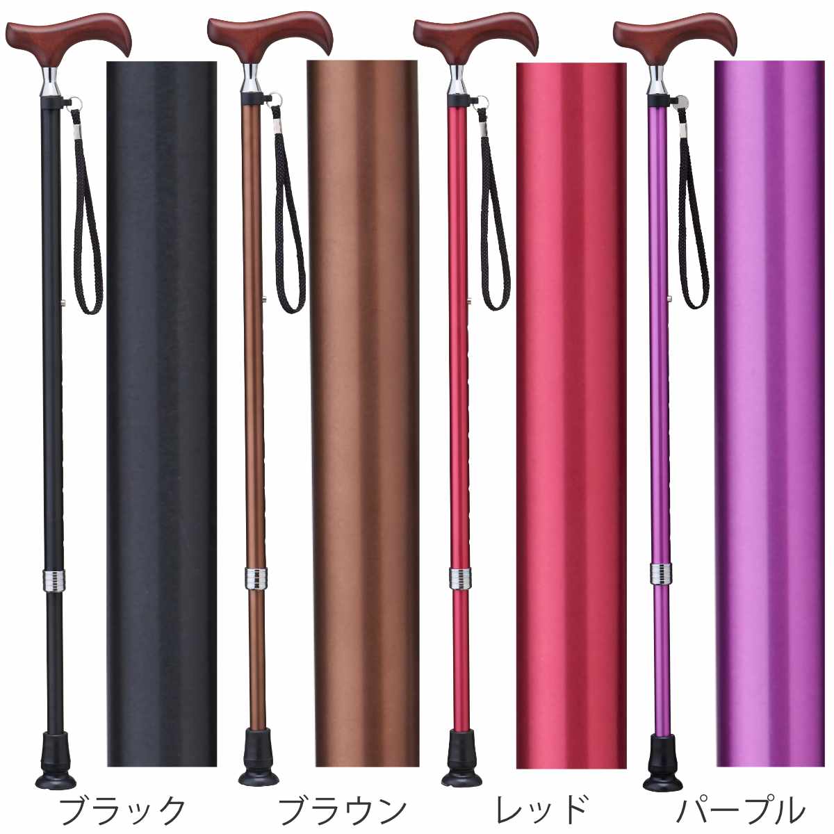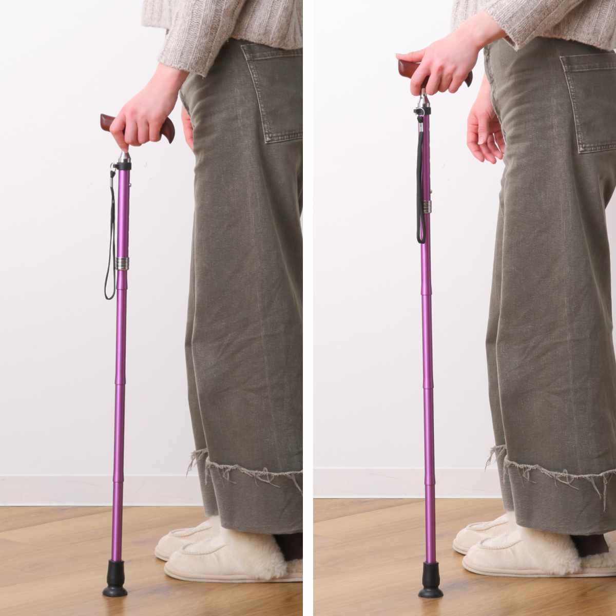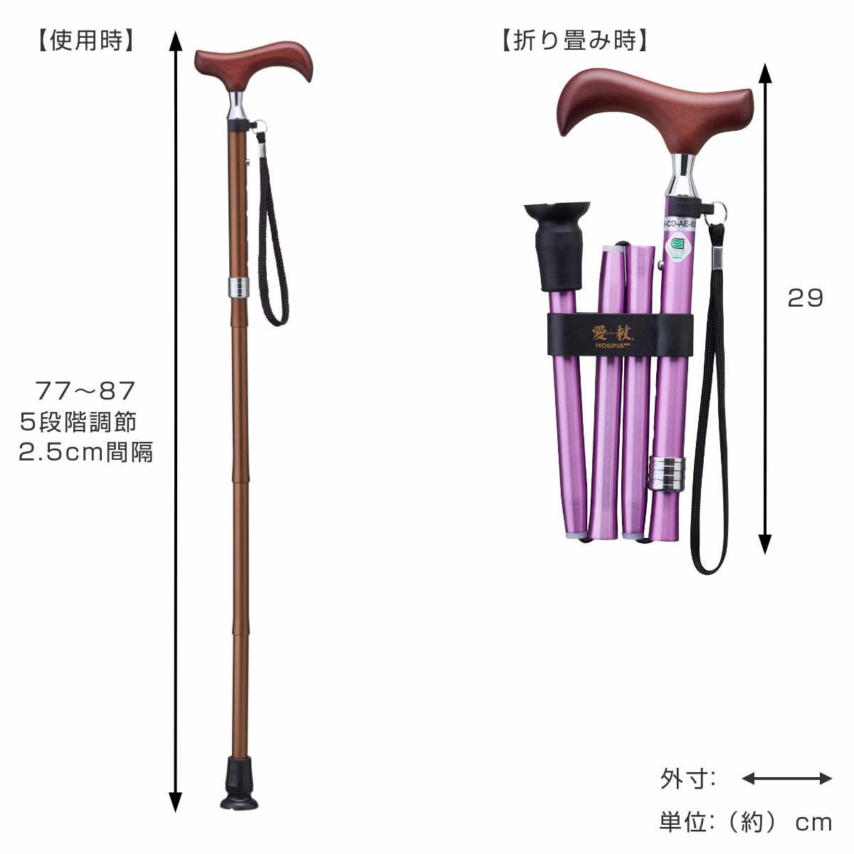 | サイズ | 長さ:(使用時)77~87cm (折り畳み時)29cm 伸縮5段階(2.5cmピッチ) 杖先ゴム径:16mm グリップ:長さ:約 12(cm) |