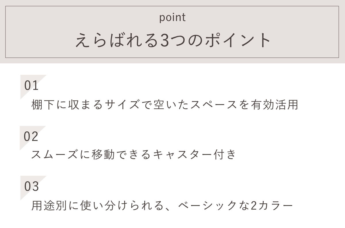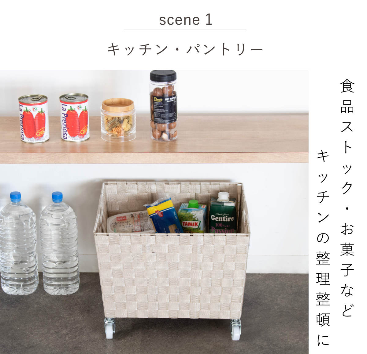 棚下に収まるサイズで、キッチンカウンター下や玄関のベンチ下など見落としがちなスペースを活用できます。キッチンで場所を取りがちなお子さんのお菓子もスッキリ隠して収納しておけます。