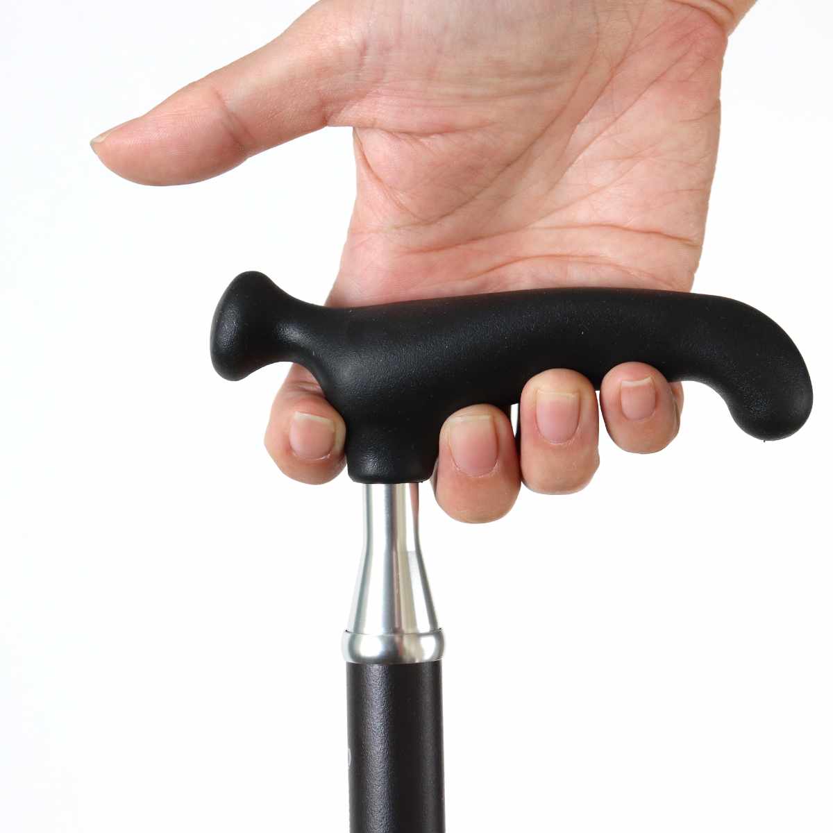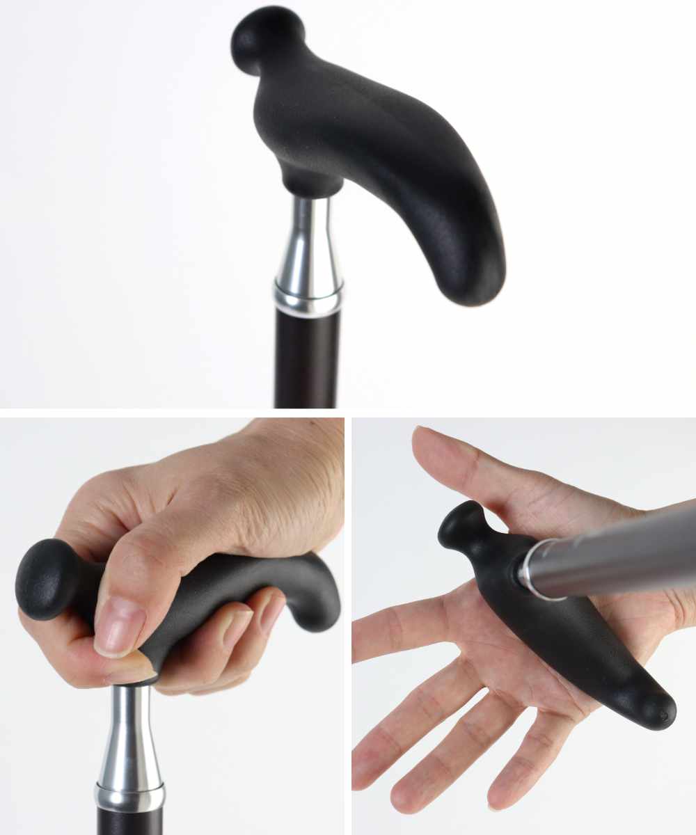 腕とステッキが一直線になるように持ってください。グリップの一部だけを握ると不安定になり危険です。