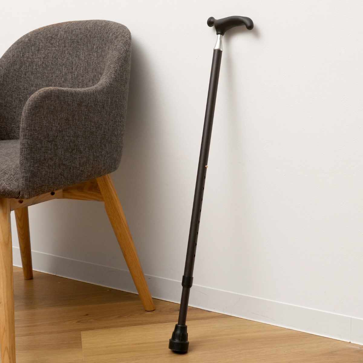 特殊加工で滑りにくいグリップと安定感がある杖先ゴムによって、壁に立てかけても倒れにくい仕様です。