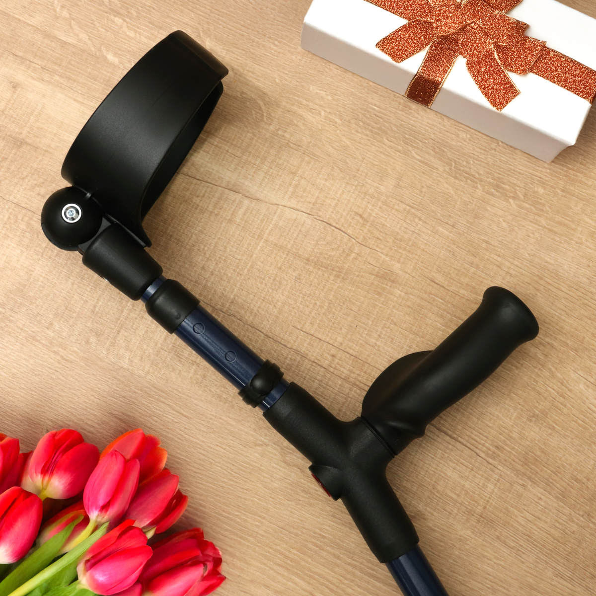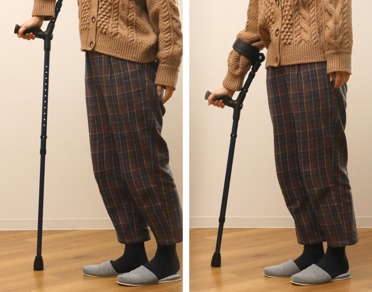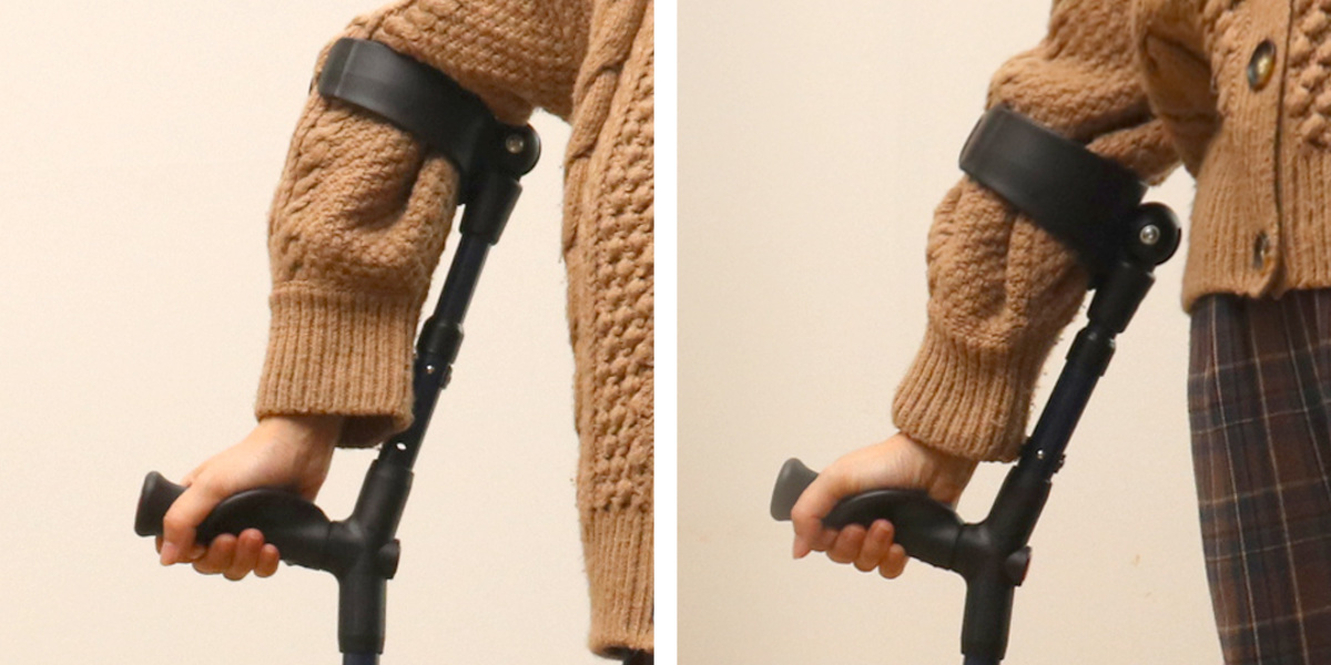 手首だけでなく、腕との2点で体重を分散して支えるため、T字杖よりも安定した歩行ができます。握力の弱い方、手首に力が入りにくい方に適しています。