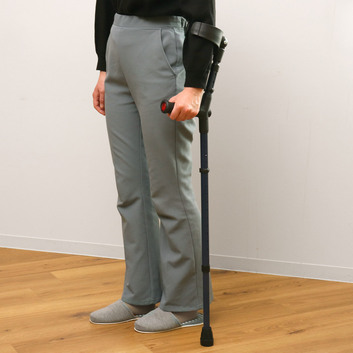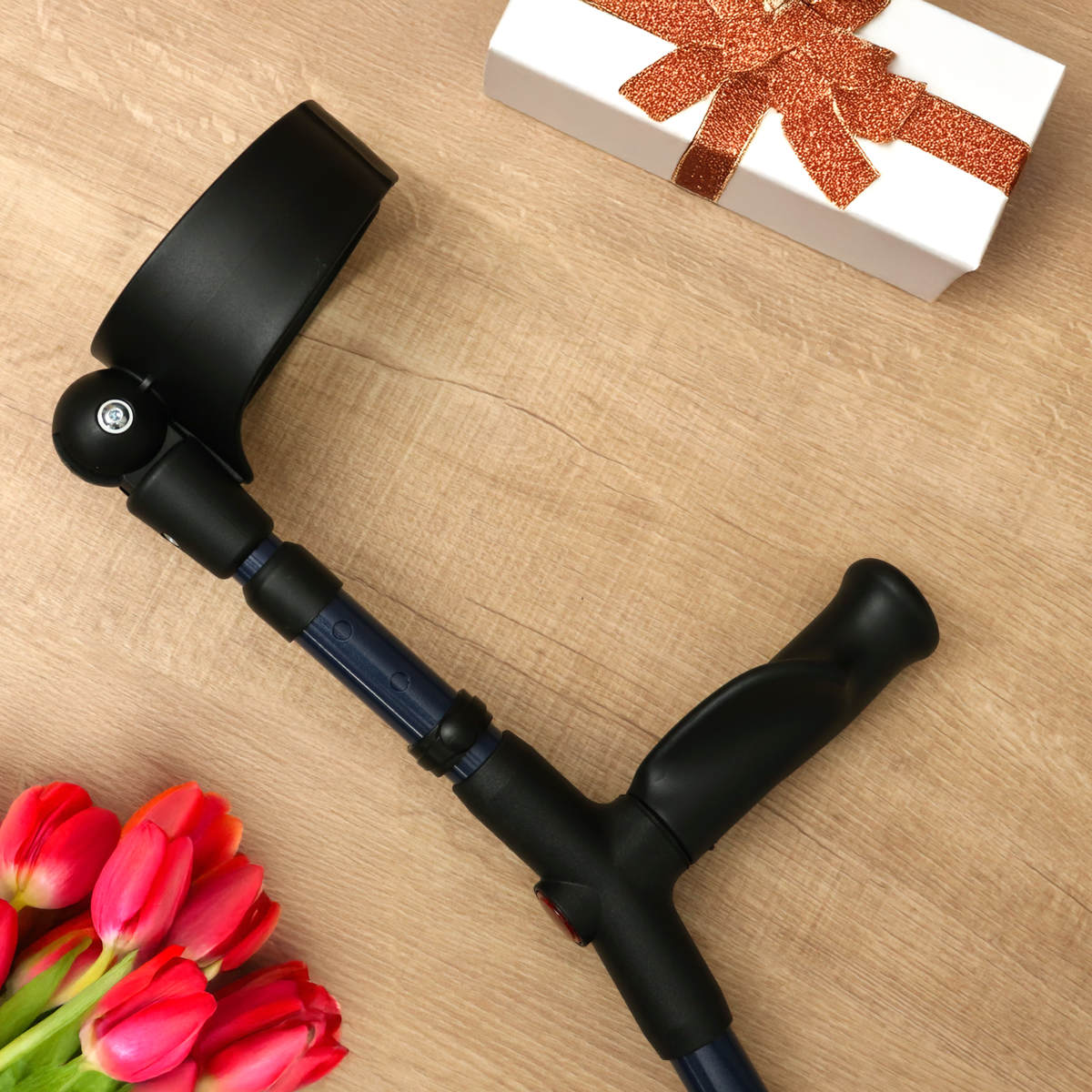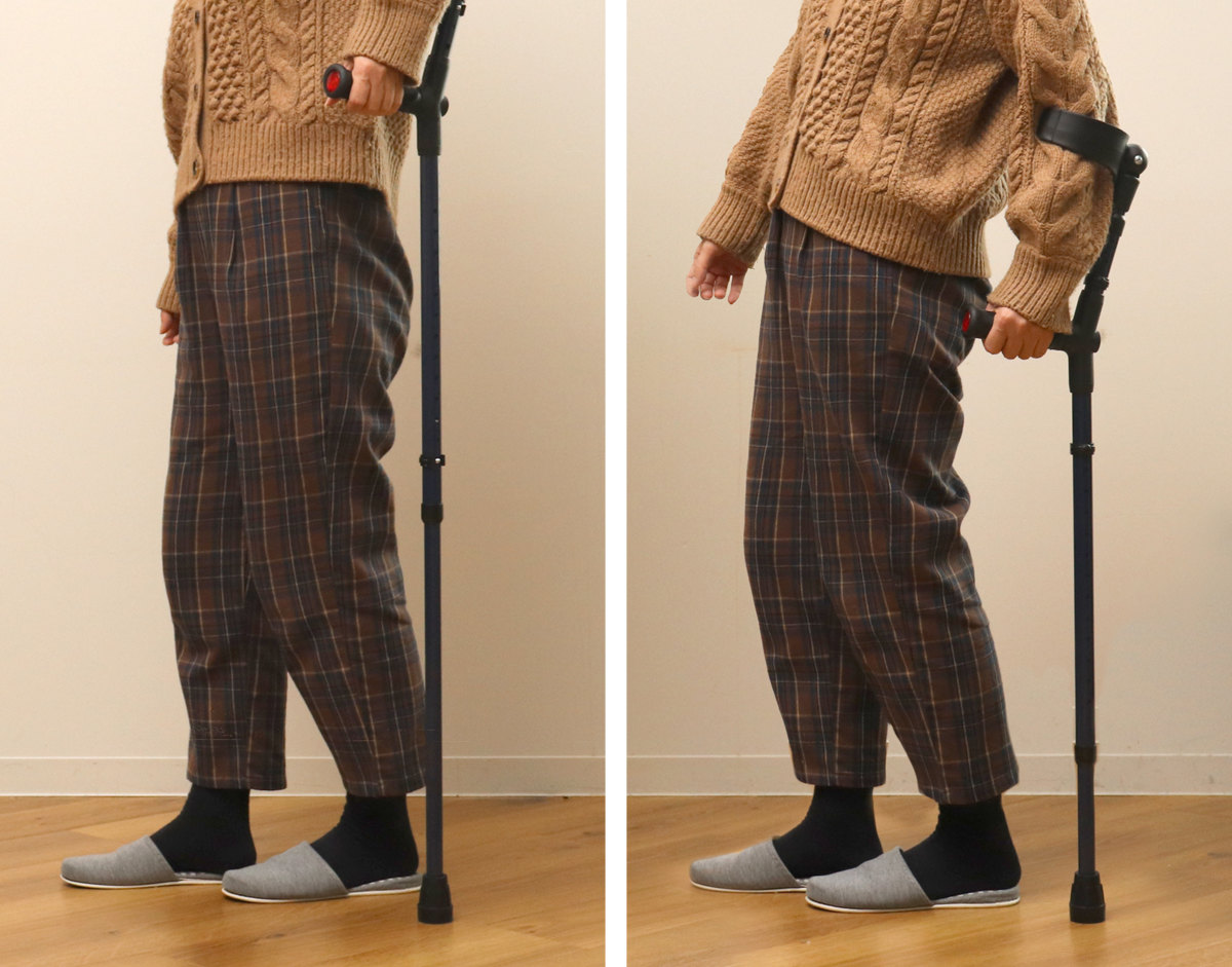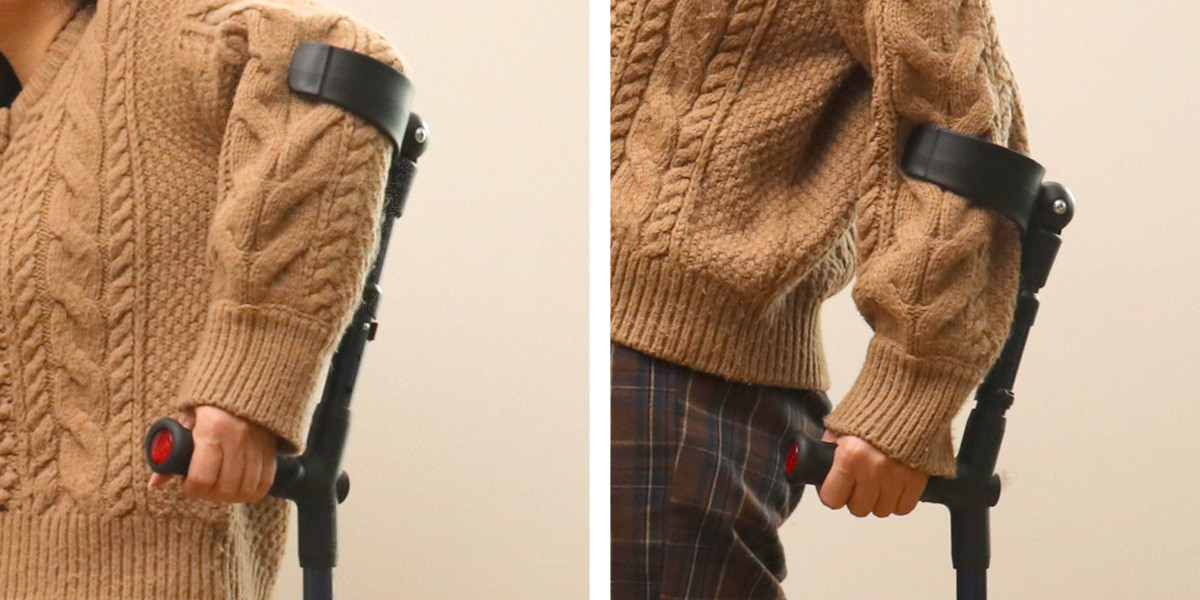 手首だけでなく、腕との2点で体重を分散して支えるため、T字杖よりも安定した歩行ができます。握力の弱い方、手首に力が入りにくい方に適しています。