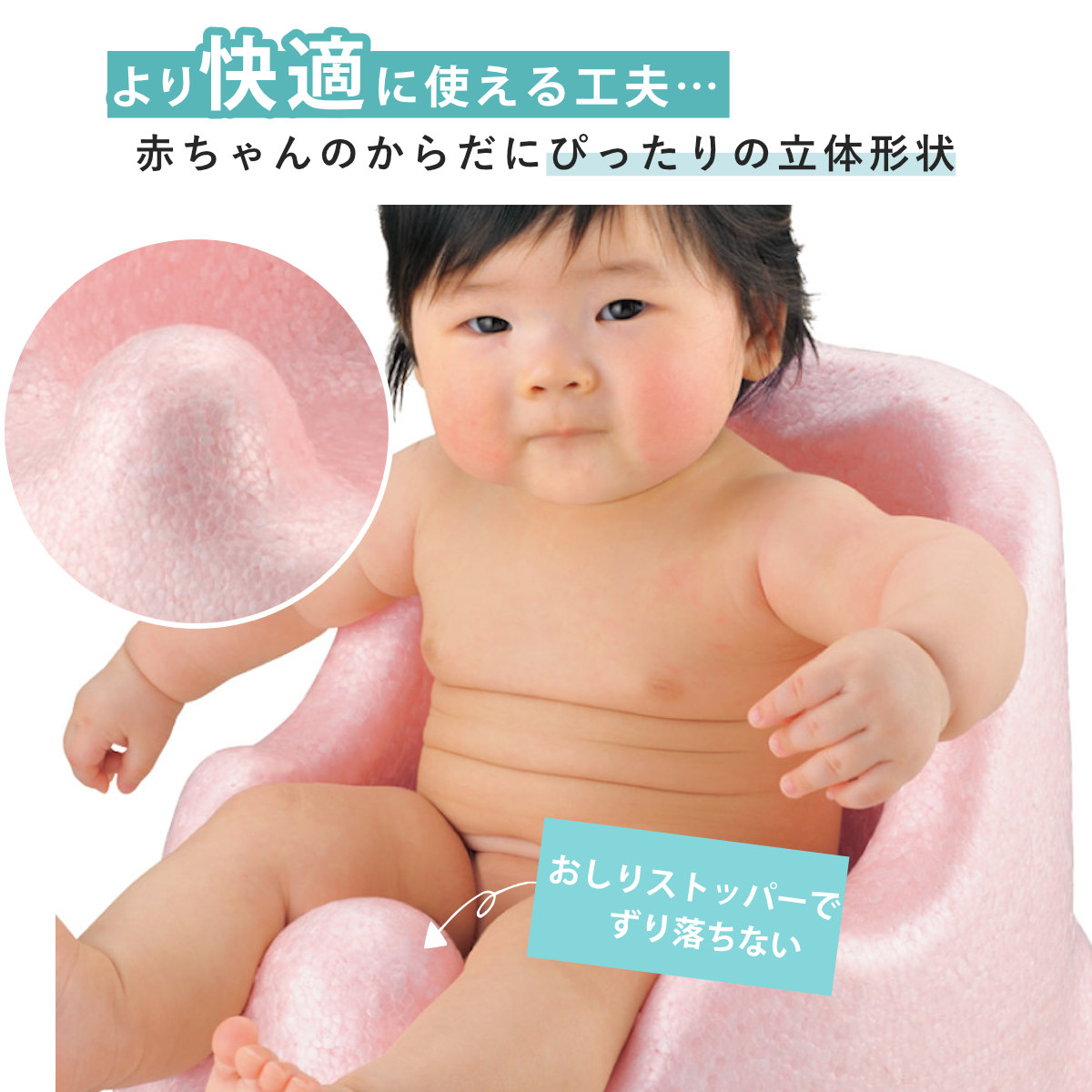 そのままでもほんのり温かい素材ですが、座面に少量のお湯をためると、さらに心地よく快適に過ごせます。おしりを包み込むような深めの座面形状で、湯たんぽのようにじんわりと赤ちゃんのおしりを温めます。