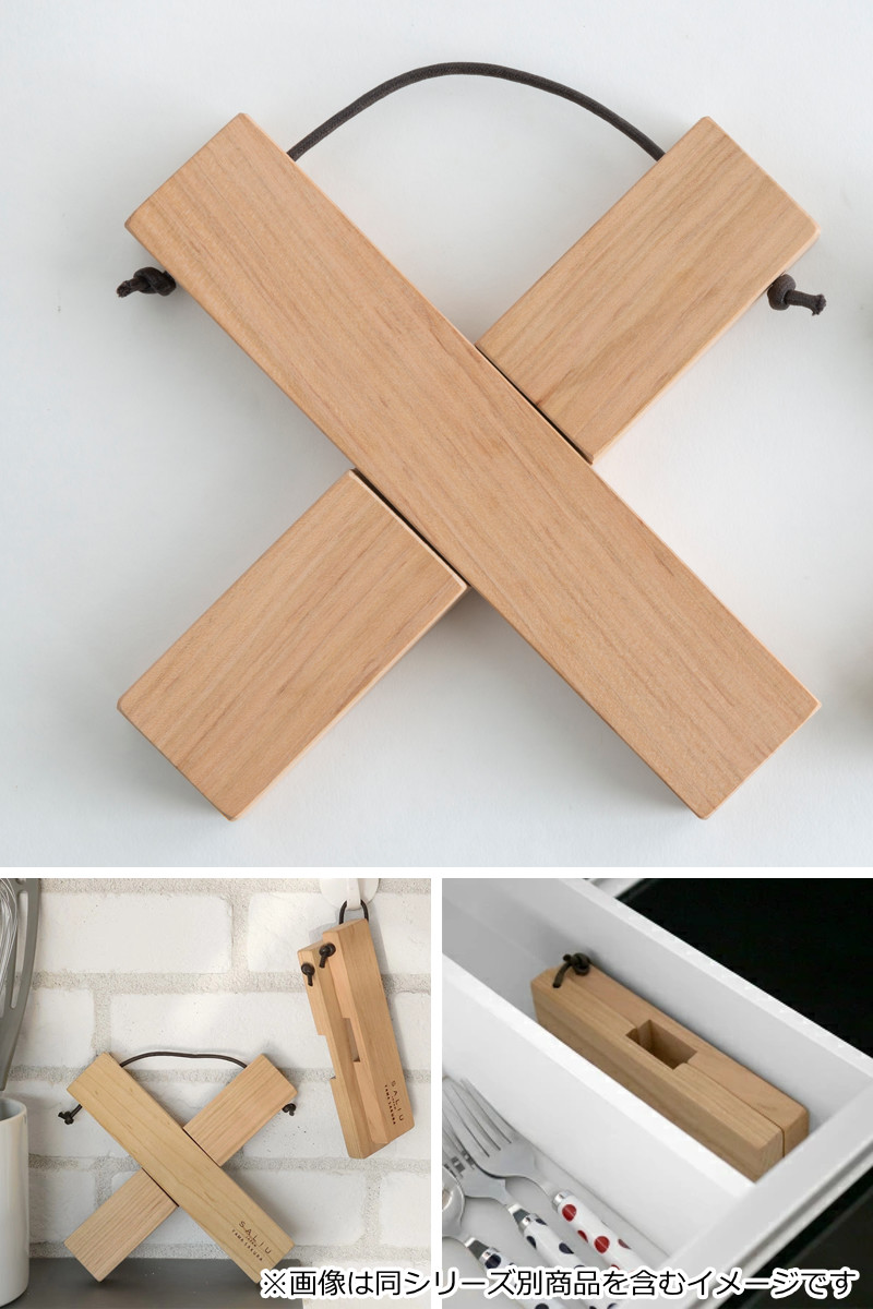 使用するときは2本の木を十字の形に組んで使います。使い終わったらまた2本の木に戻せば収納の際に場所を取りません。フックに掛けたり、引き出しなどのわずかな隙間にも収納できます。