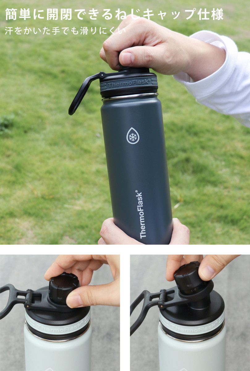 ボトルの蓋は、汗をかいた手でも滑りにくく開けやすい、ねじキャップ仕様です。PETボトルの使用感で開閉できます。一体型なので、蓋をなくす心配がありません。外で使用する時や、お子様が使用する時でも安心してお使いいただけます。