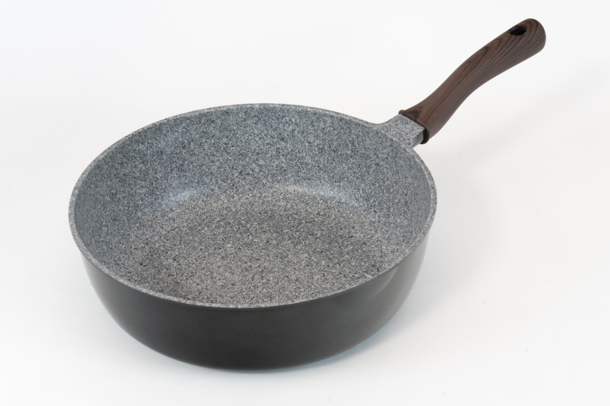 焼く、炒める、茹でる、煮る、揚げる、ができる、深型のフライパンです。内面はグレーのマーブル柄がシックで、ブラック×木目が落ち着いた雰囲気なので、そのまま食卓へ出してもお料理を引き立ててくれます。