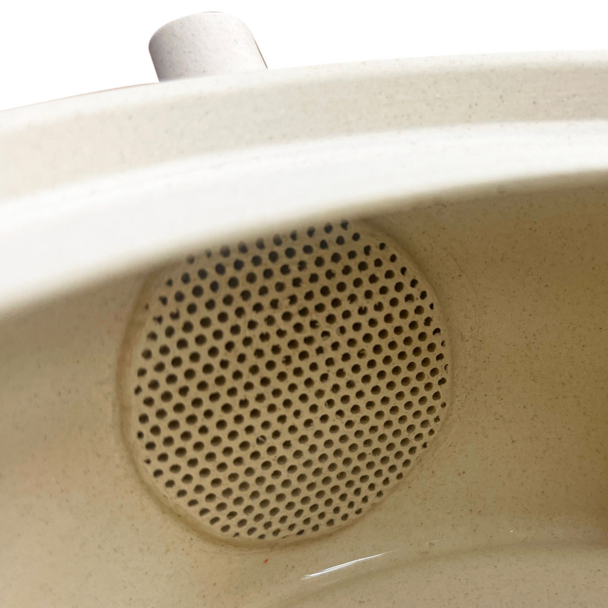 本体に微細な穴がたくさん空いているタイプの茶漉し (セラメッシュフィルター) を採用しています。金属製の茶こしと違い金属臭や雑味が生まれないので、お茶本来の美味しさを味わえます。