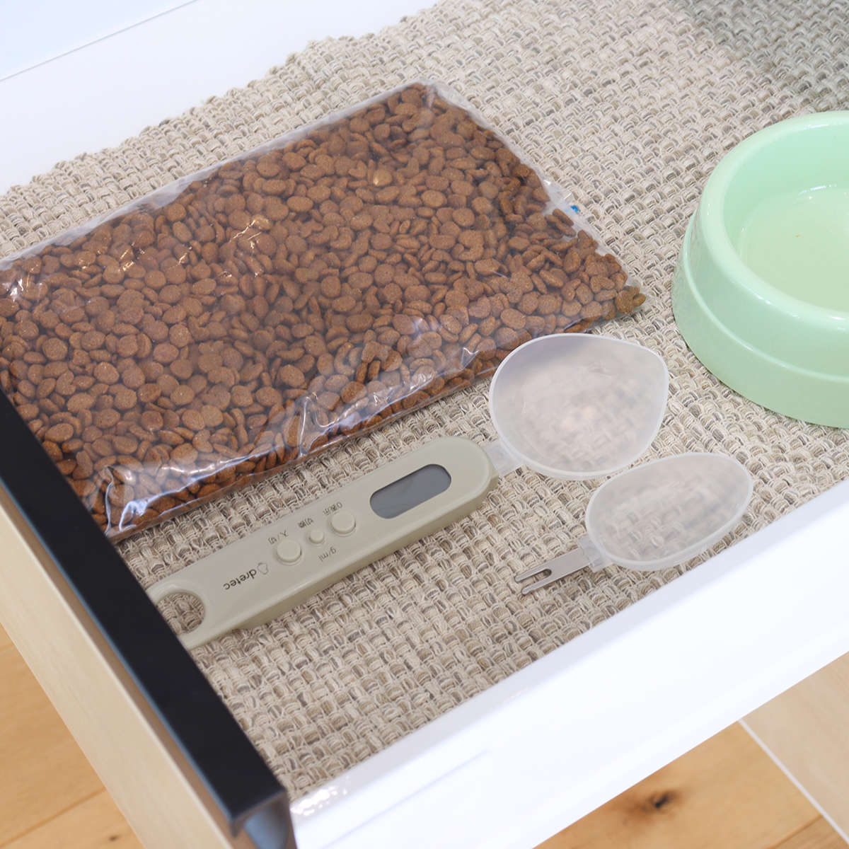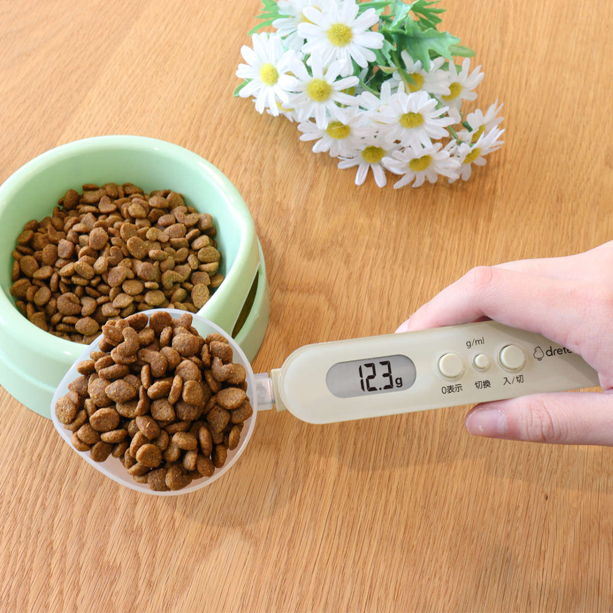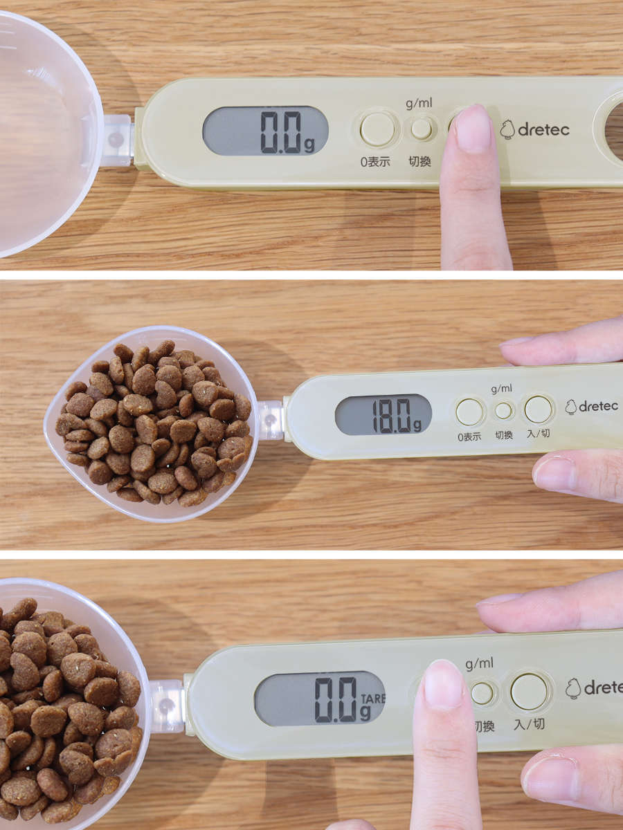 スプーン型のスケールで、ごはんやおやつをラクに測れる計量スプーンです。毎回、同じ量をあげることができるので、毎日の体調管理も安心です。