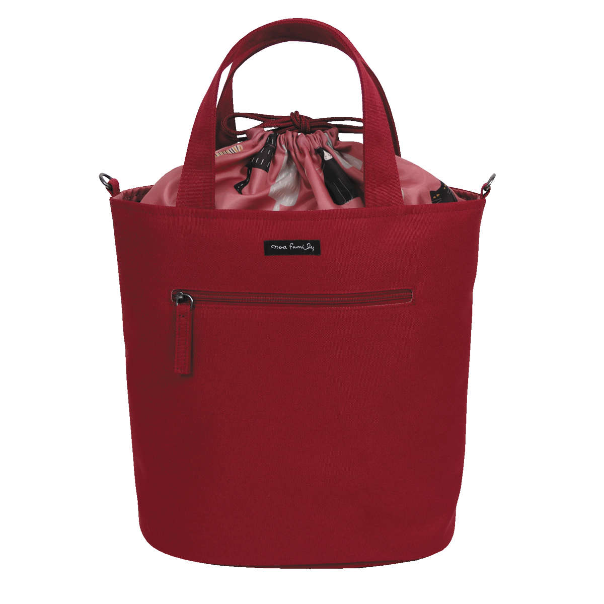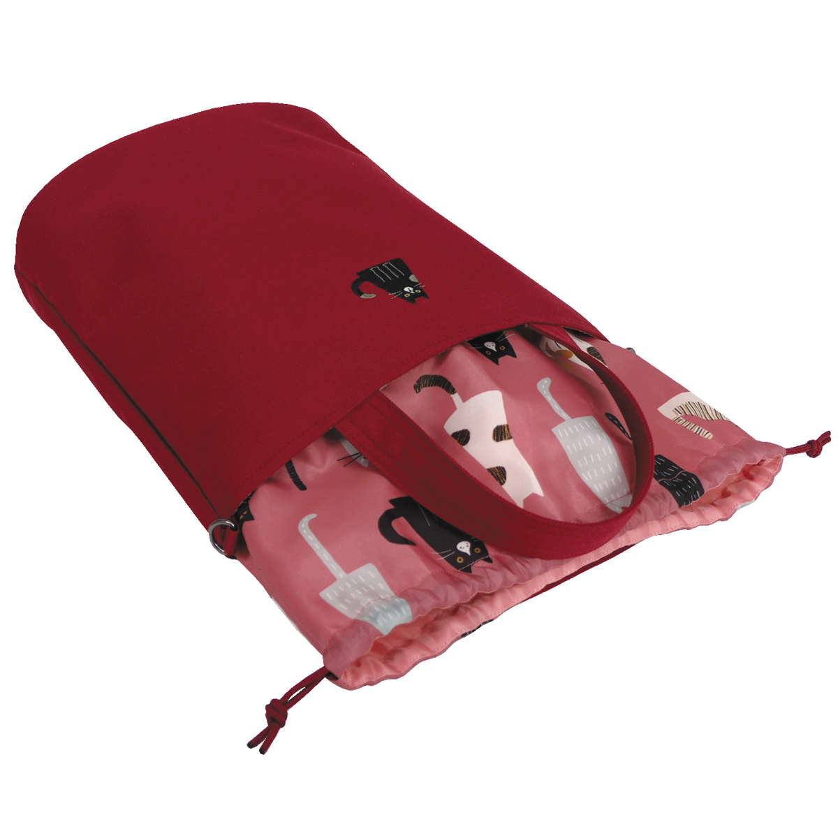 バッグの口は巾着で開閉できるようになっていて、中身が見えず安心です。バッグ本体、巾着部分ともに撥水加工されているので、汚れに強く長持ちします。フロントには愛らしい表情のネコの刺繍入りです。
