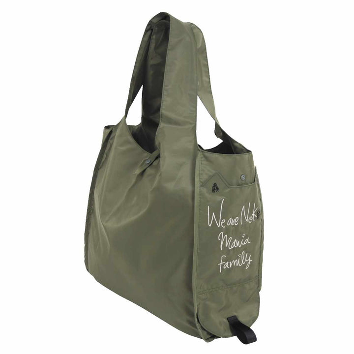 バッグの口部分にはドットボタン留めがついていて、中身が多くなっても収まりがよくなって持ちやすいです。撥水加工のポリエステルを使用しているので、冷凍・冷蔵食品の水滴がついて濡れても安心です。