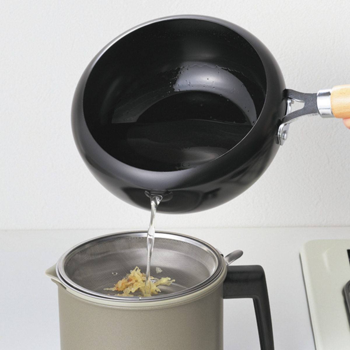少量の揚げ物や、お弁当のおかず作りなどにも最適なサイズです。扱いやすい片手鍋タイプで、必要な時にサッと取り出して使えます。また、フタ付きなので短期間の油の保管に便利です。