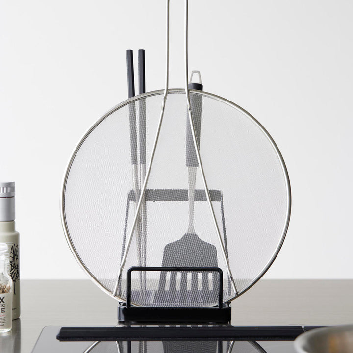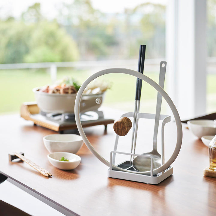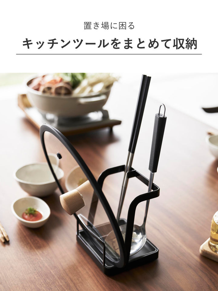 調理中のお玉・菜箸・鍋蓋を立て掛けて一時置きできる、多機能で便利なお玉スタンド Lサイズです。置き場に困るキッチンツールをまとめて収納できるので、食卓でお鍋の際にも重宝します。