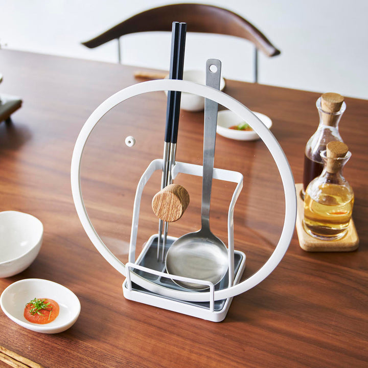 鍋蓋を収納したままお玉・菜箸の出し入れができます。いちいちどかしたりずらしたりする必要がないので、調理中に使いたいものをさっと手に取れます。