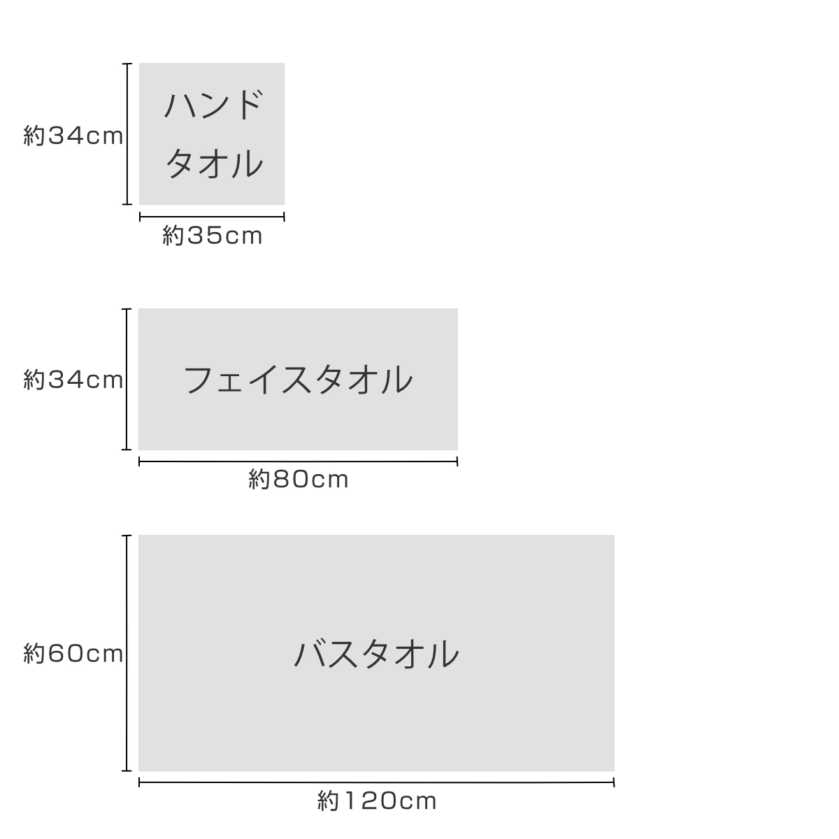 バスタオル、フェイスタオル、ハンドタオル、の3サイズをご用意しています。用途に合わせてお選びいただけます。