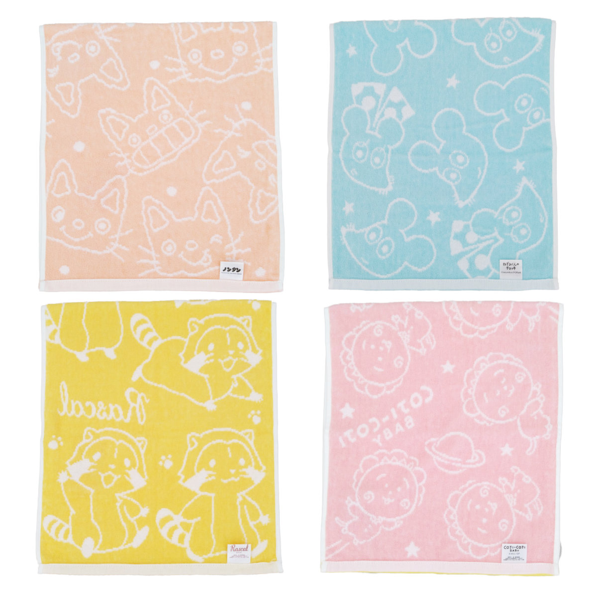 ノンタン、ねずみくんのチョッキ、ラスカル、コジコジがそれぞれデザインされたフェイスタオルです。やさしいポップな色合いと、大きめの総柄がかわいいです。自分用にはもちろん、プレゼントにもおすすめです。