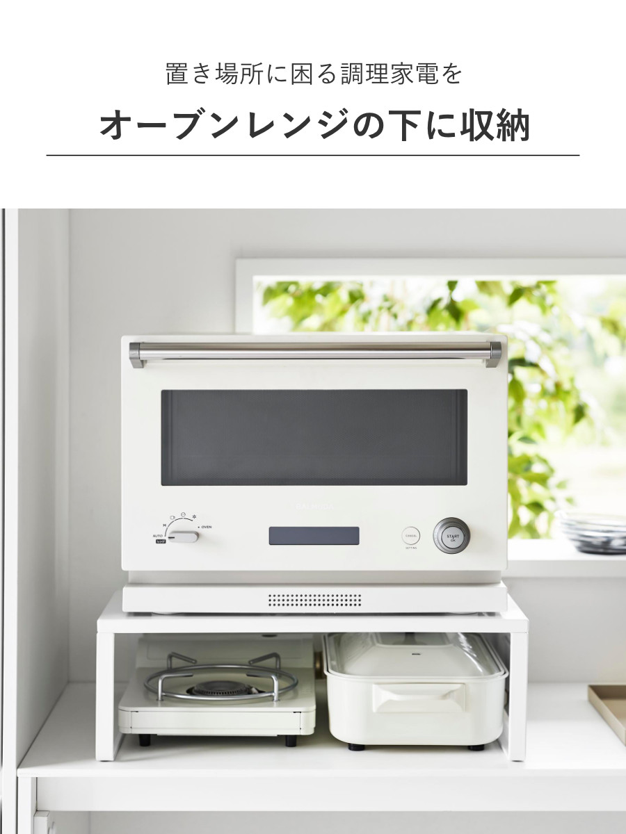 オーブンレンジの下に収納スペースが作れるラックです。かさばって置き場所に困るホットプレートやカセットコンロの収納場所におすすめです。