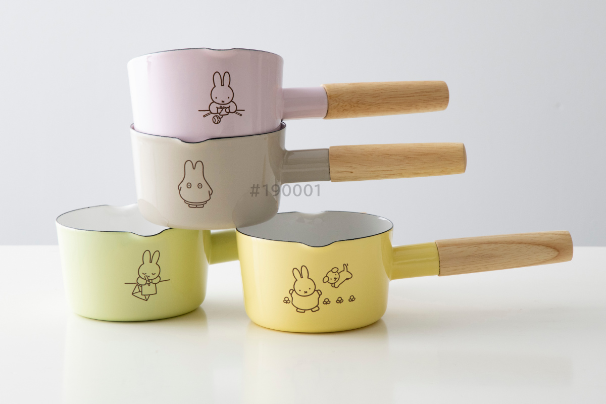 本体両面と内面の絵柄を合わせて、ストーリー性のあるミッフィーをデザインしたミルクパンです。4種類4色の明るくかわいいパステルシリーズです。