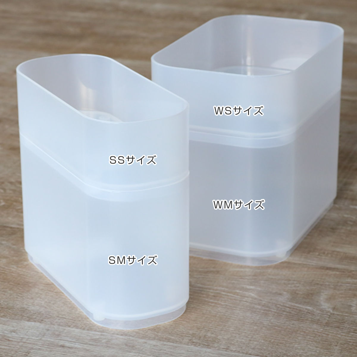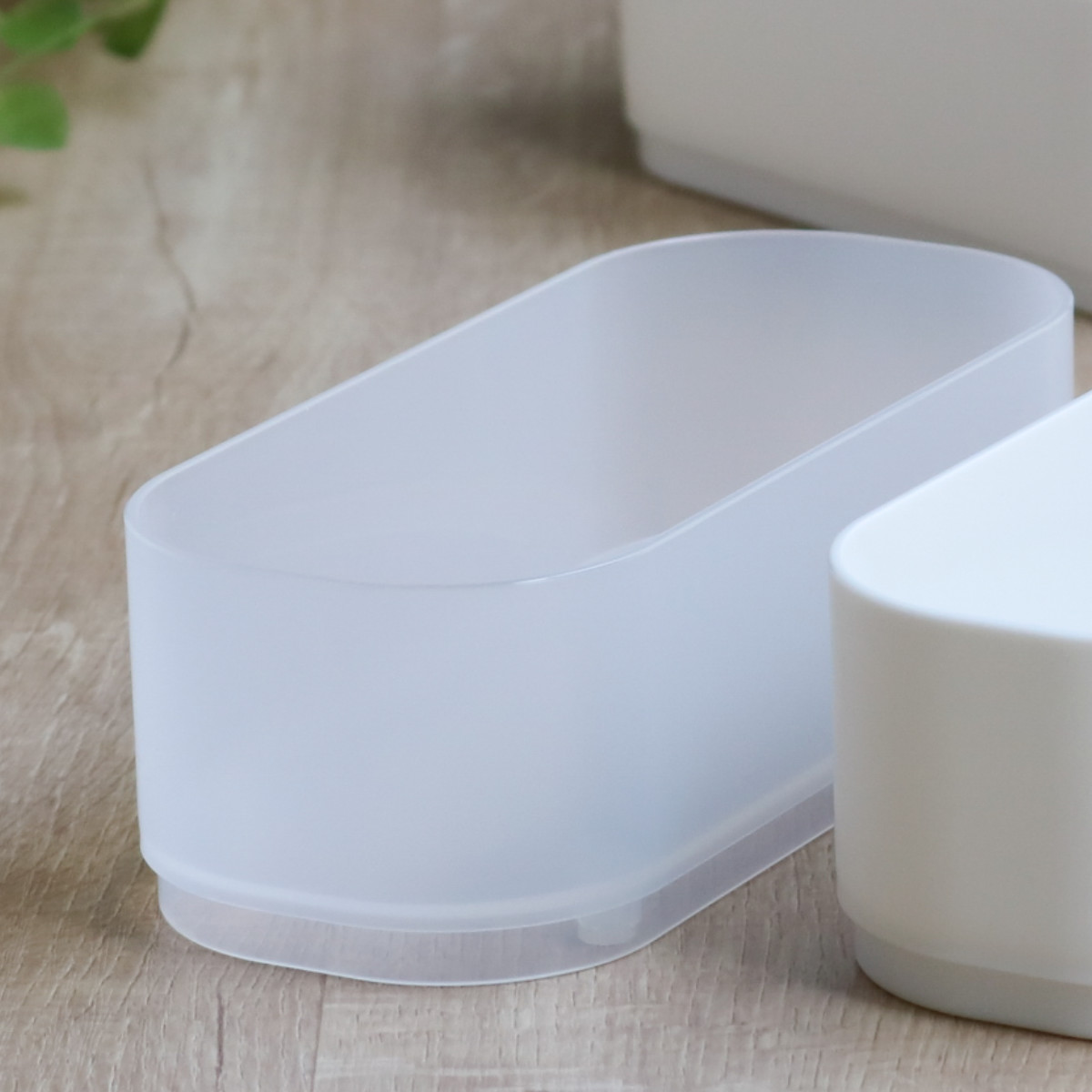 収納物がうっすら見える半透明タイプです。中身をほんのり隠しつつ、すっきりした印象を保つことができます。プラスチック素材のため汚れてもすぐにお手入れできるのも嬉しいポイントです。