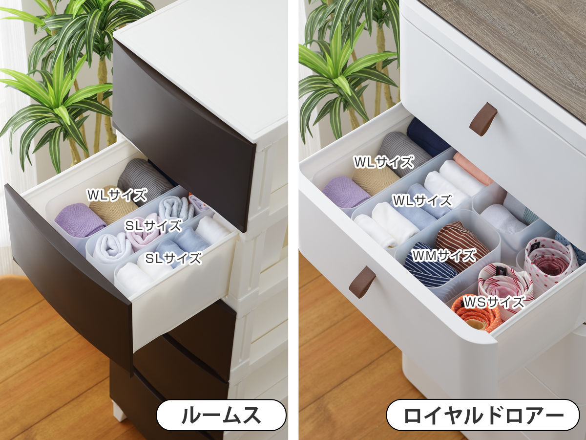 別売りのケース「インボックスソフト」やチェスト「ロイヤルドロアー」「ルームス」にぴったり収まるサイズ設計です。ボックスの中を仕切れて、小物を種類別に整理整頓出来ます。