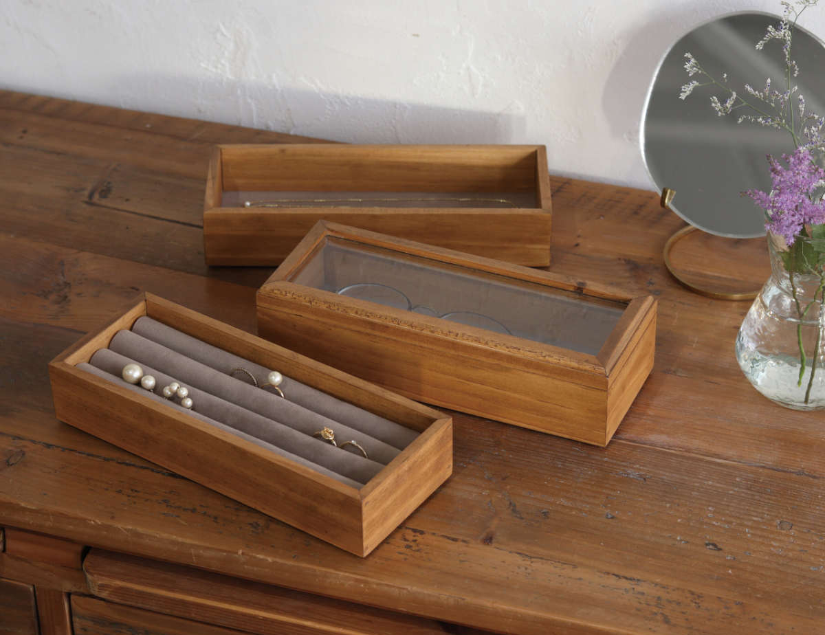木のぬくもりを感じられるアクセサリーケースです。リングや、メガネ、ネックレスなど日常使いのアクセサリーをまとめるのにぴったりのサイズです。