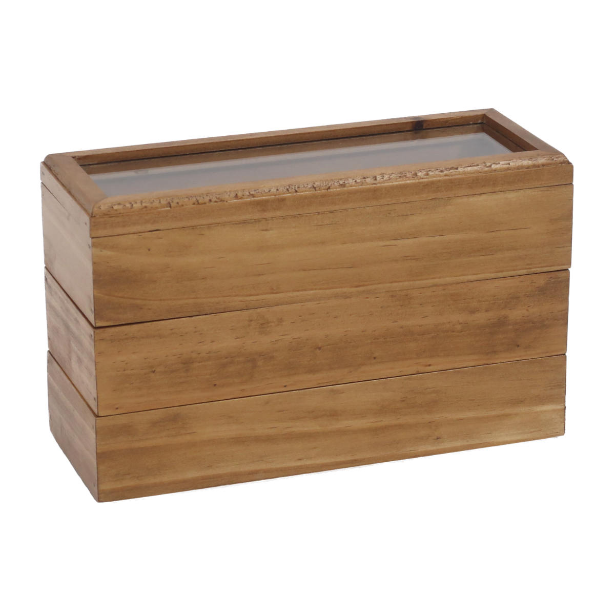 3段に重ねると省スぺ―スで収納できます。上段は透明なガラス蓋が付いており、蓋を開けなくても中身を確認できます。