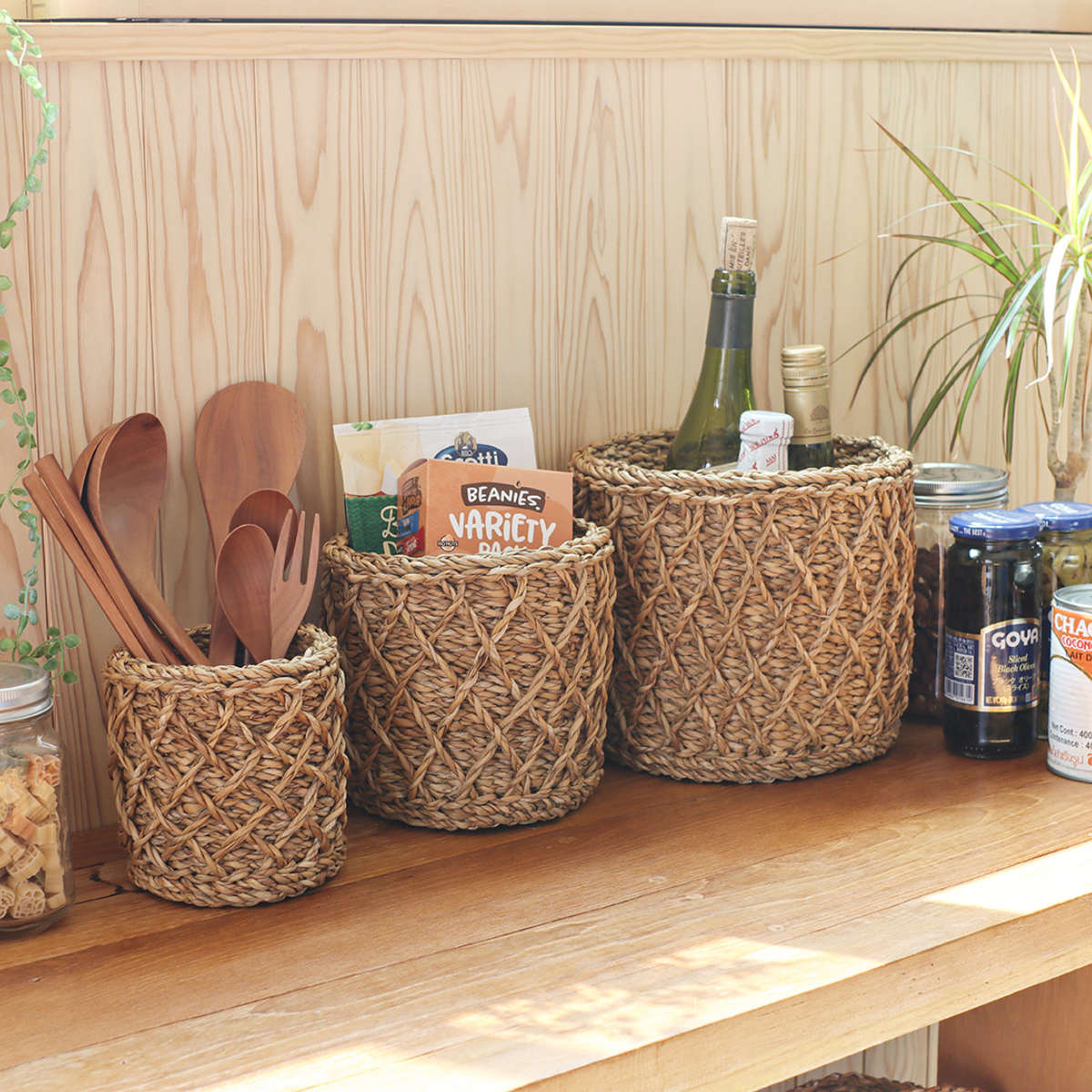キッチンツールや文房具などの実用的なアイテムを、バスケットに収納するだけで生活感を抑えスタイリッシュな空間を演出します。