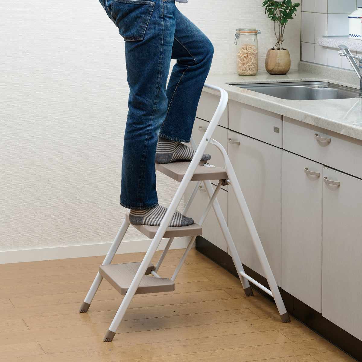 踏み台や作業の腰かけなどにワンタッチで簡単に使える3段ステップです。ステップ面は奥行き約21.5cmと幅広設計なので、足をしっかりと付いて登り下りができます。高いところのものを取りたい時にも安定感抜群です。