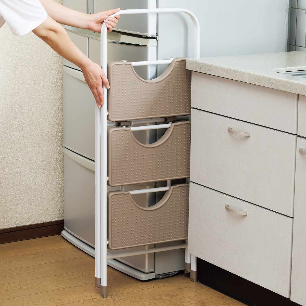 折りたたむと奥行き7.5cmまで薄くなるので、冷蔵庫の横やベッドの下など、ちょっとした隙間に収納できます。また、持ち運ぶときにもスリムになるので便利です。