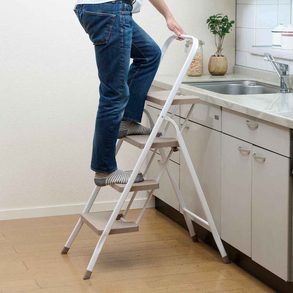 踏み台や作業の腰かけなどにワンタッチで簡単に使える4段ステップです。ステップ面は奥行き約21.5cmと幅広設計なので、足をしっかりと付いて登り下りができます。高いところのものを取りたい時にも安定感抜群です。