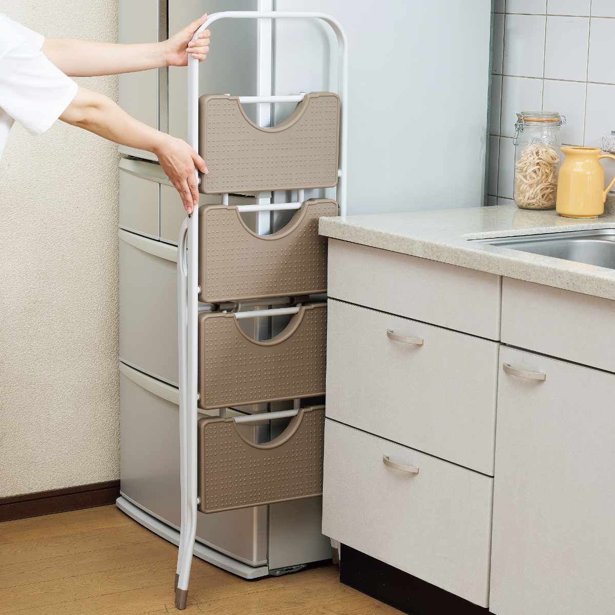 折りたたむと奥行き7.5cmまで薄くなるので、冷蔵庫の横やベッドの下など、ちょっとした隙間に収納できます。また、持ち運ぶときにもスリムになるので便利です。