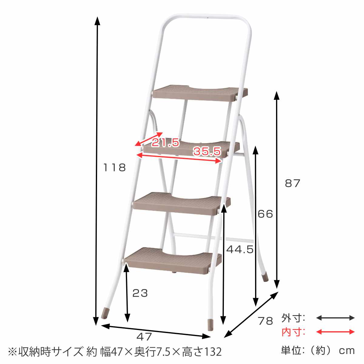 | サイズ | 約 幅47×奥行78×高さ118(cm) 折りたたみ時サイズ:約 幅47×奥行7.5×高さ132(cm) 踏板高さ:1段目/約 23cm、2段目/約 44.5cm、3段目/約 66cm、4段目/約 87cm 踏板サイズ:約 幅35.5×奥行21.5(cm) |