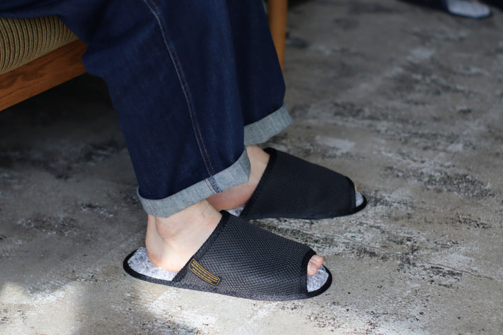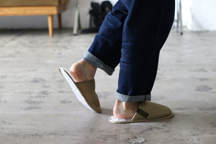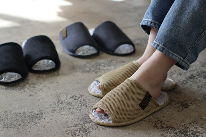 通気性が良く、丸洗いできる機能性スリッパです。ソール部分に高反発ファイバーを採用し、素材をむき出しのままにしています。まるで呼吸をしている様な心地よさ、体感してみませんか。