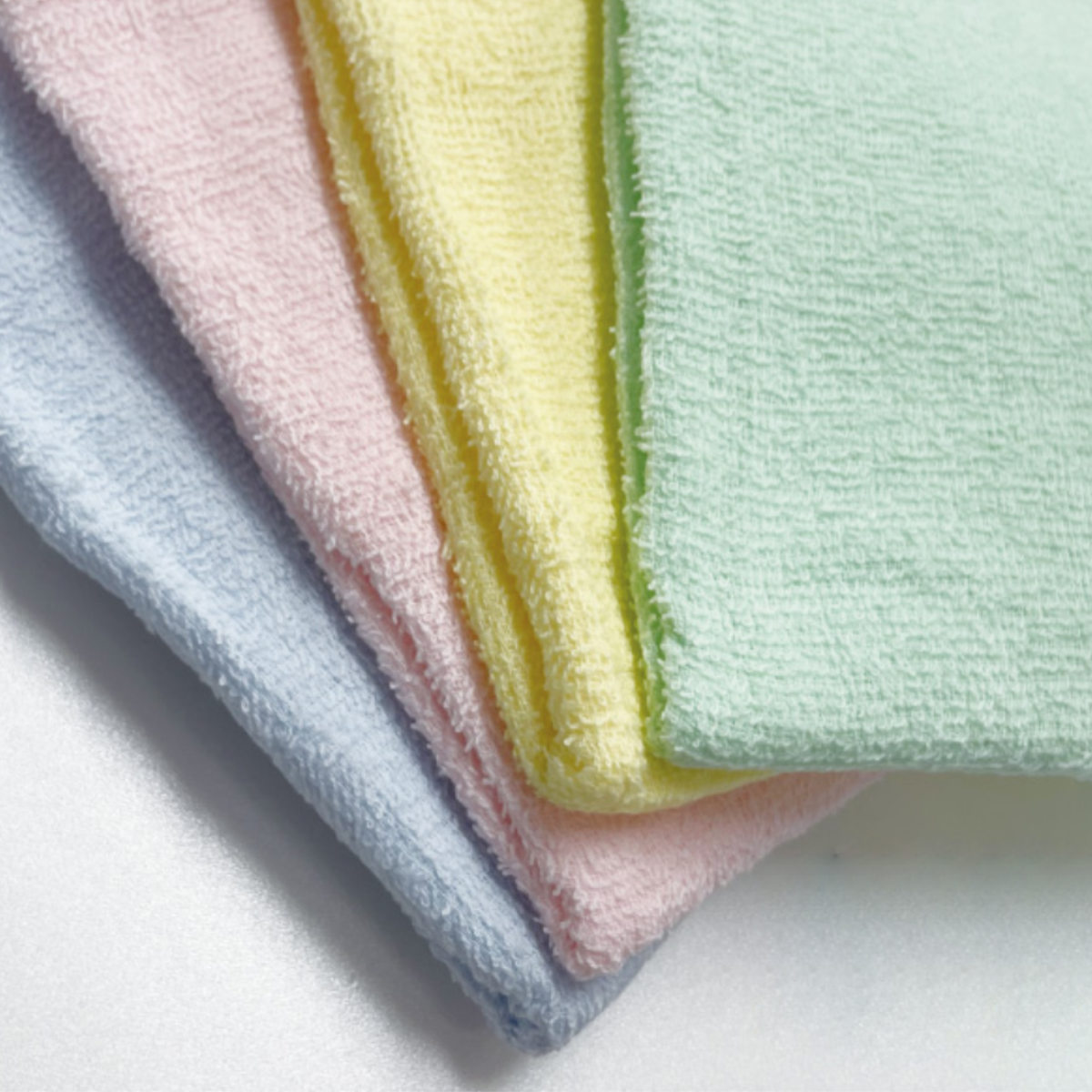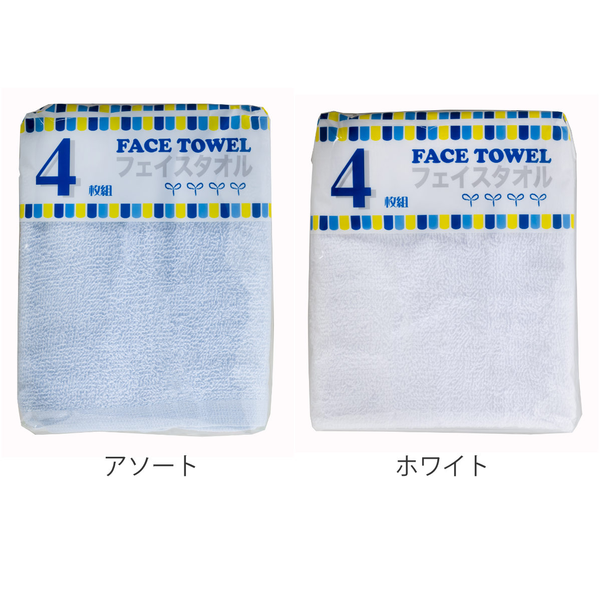 ●4枚入りで、種類はアソート(ブルー、グリーン、ピンク、イエローが各1枚)と全色ホワイトがございます。