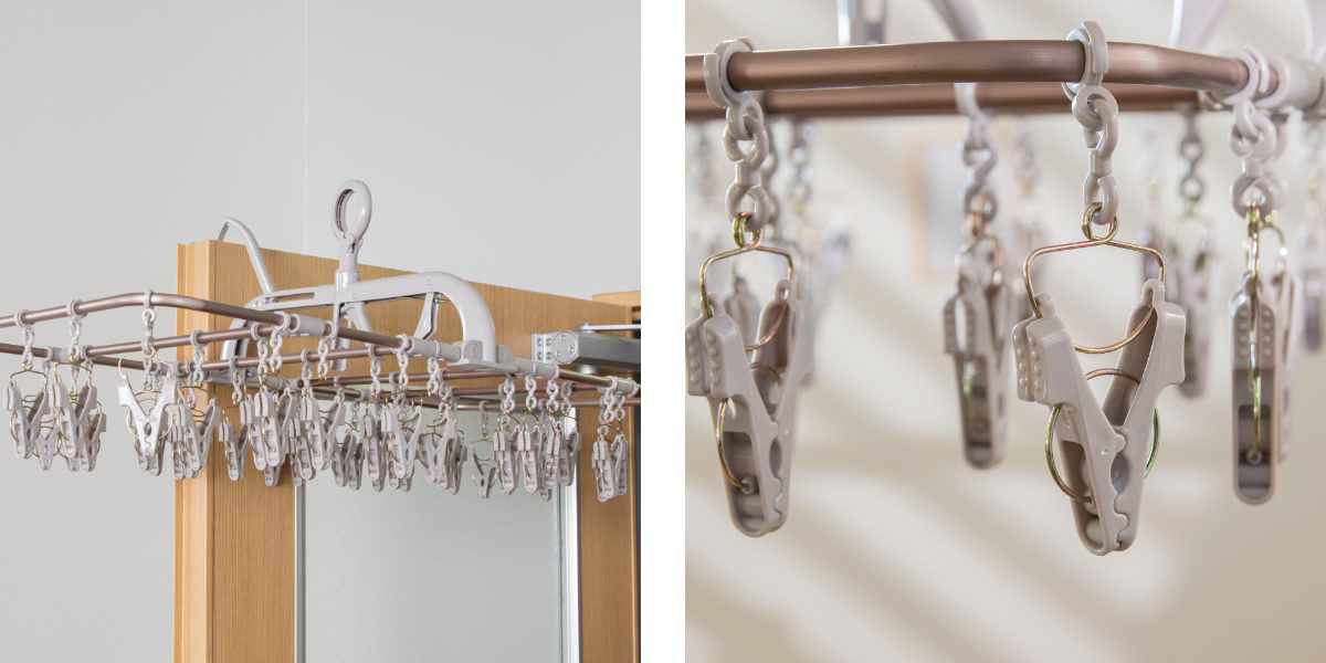 カモイフック付き カモイ掛けが付いているので、カモイに掛けて部屋干しでも活躍します。 |