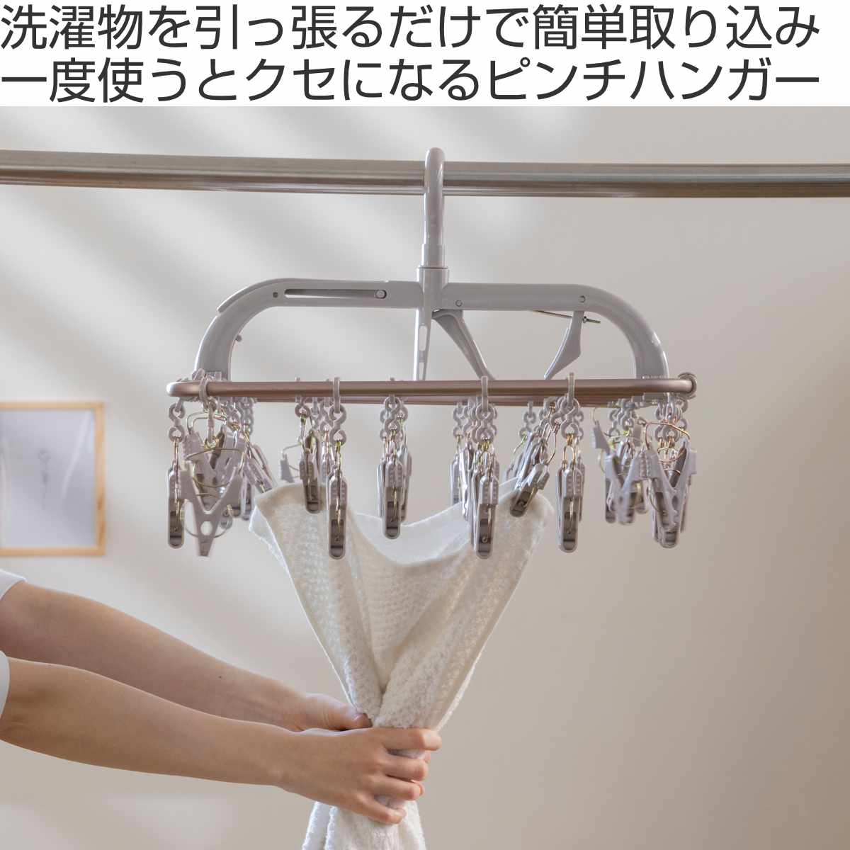 洗濯物を引っ張るだけで取り込み可能な42ピンチのランドリーハンガーです。下に引っ張ると負荷がかかってピンチが開く設計です。止める部分は緩やかなウェーブなので、デリケートな衣類も傷めにくいです。
