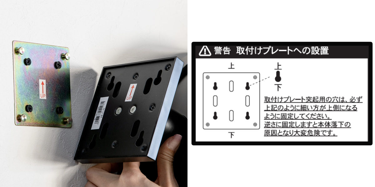 本体の穴に取付けプレートの突起をはめ、下に引き下げて固定します。