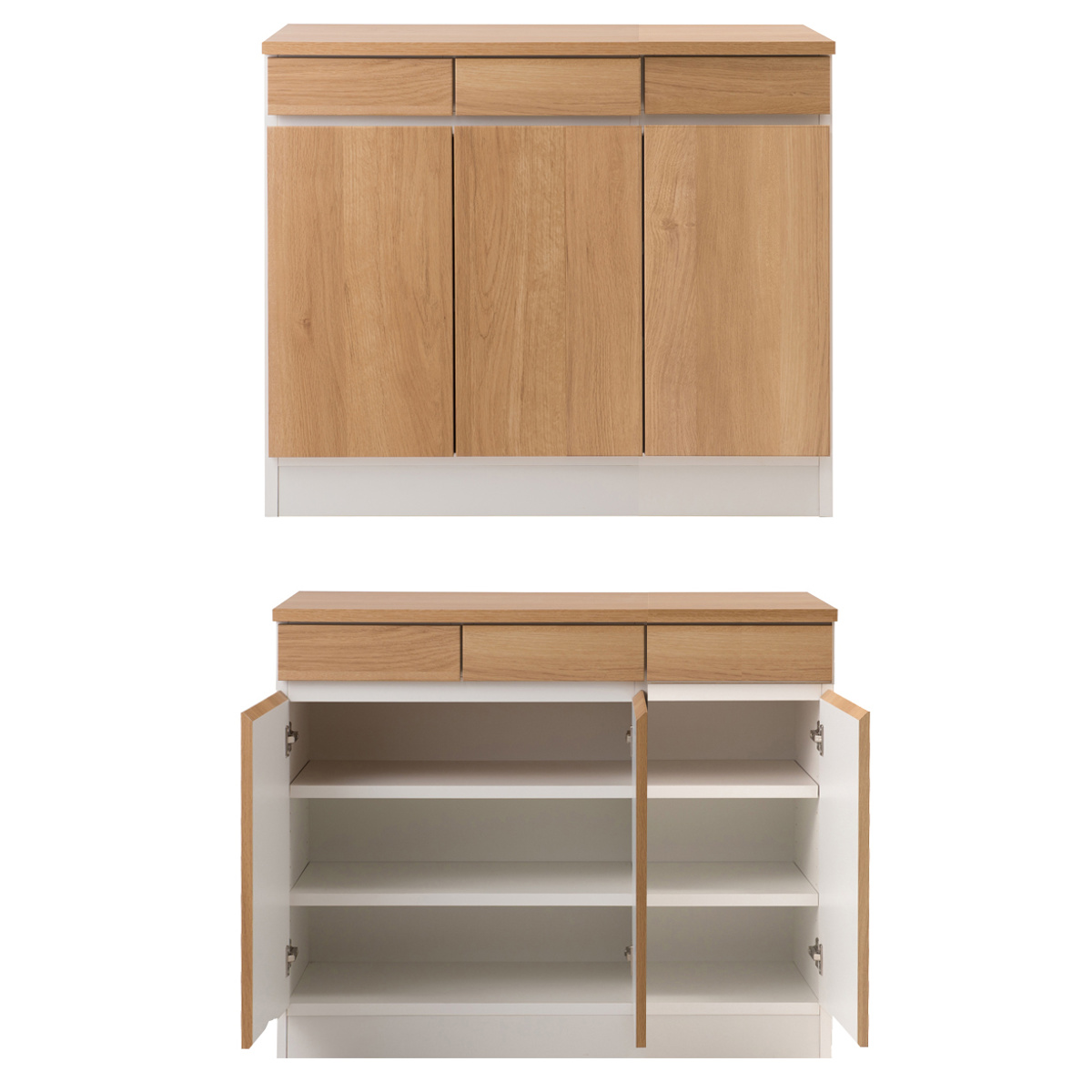 カウンター下にちょうど収まる高さのリビングボードです。同じシリーズのキャビネットなどと組み合わせば、まるで造り付けのような一体感です。キッチンやカウンター下だけでなく、玄関やリビングでのちょっとした収納として使用できます。
