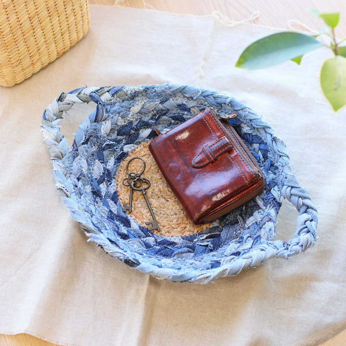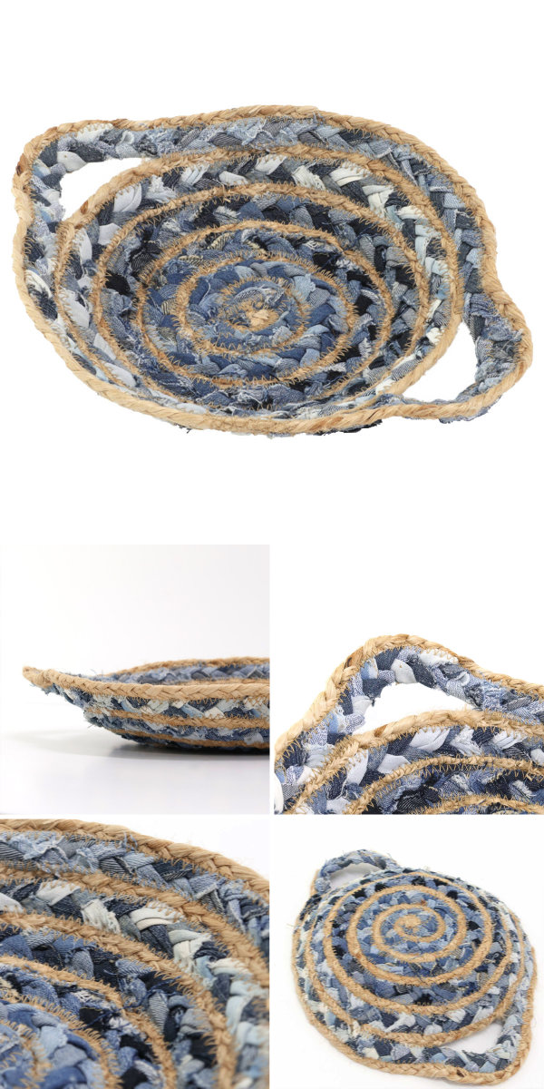 リサイクルデニムを編み込んで作られたデニムチンディの切れ端を再利用し、ジュート素材と組み合わせた環境に優しいエコなトレイです。