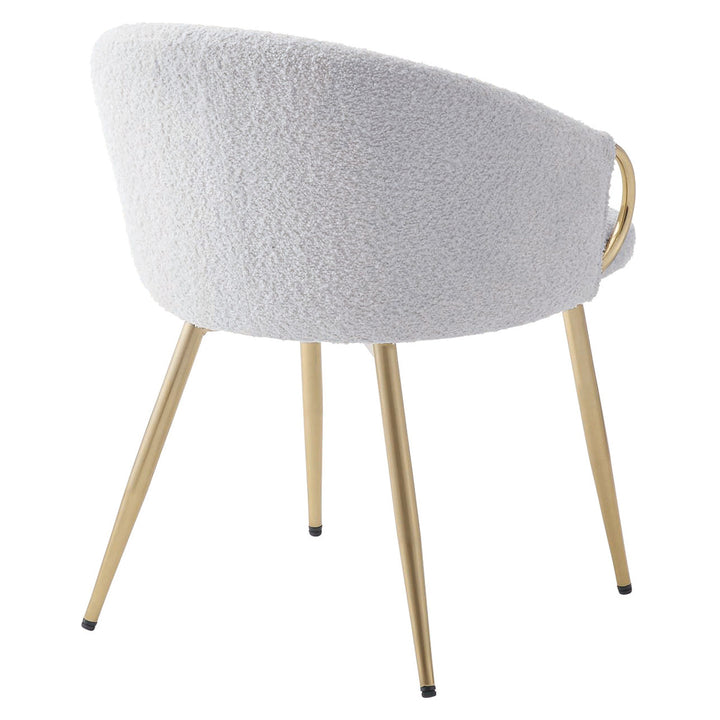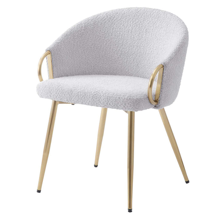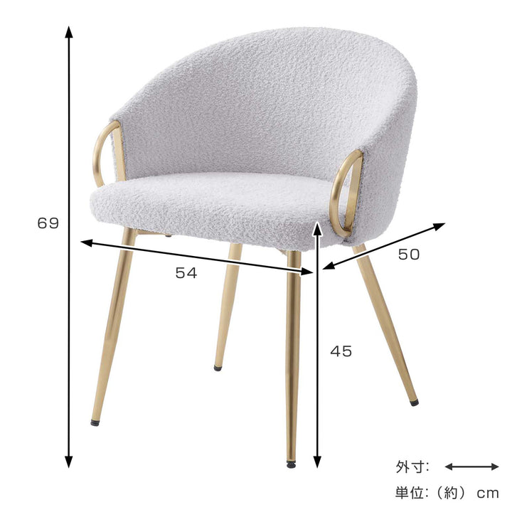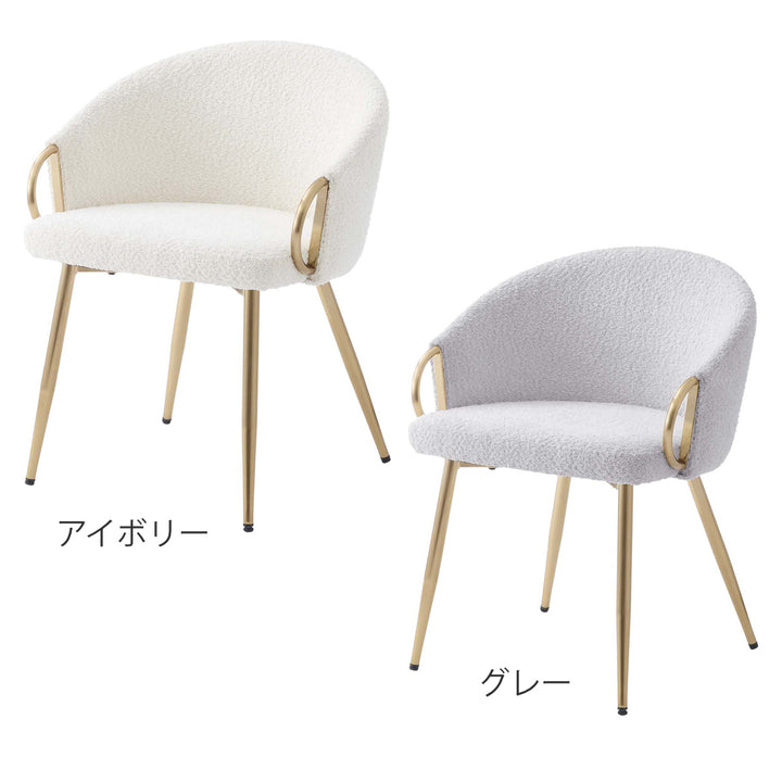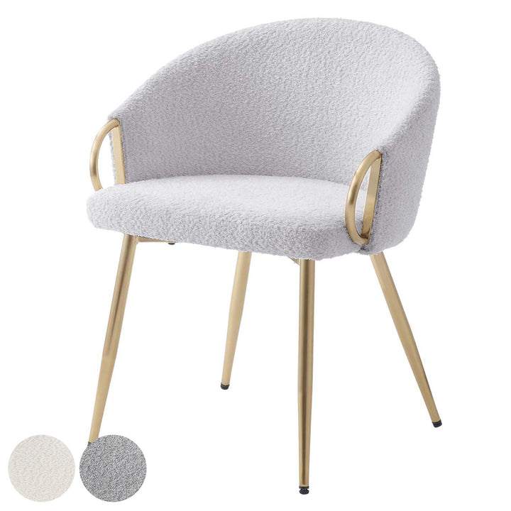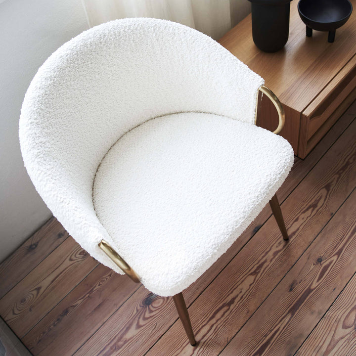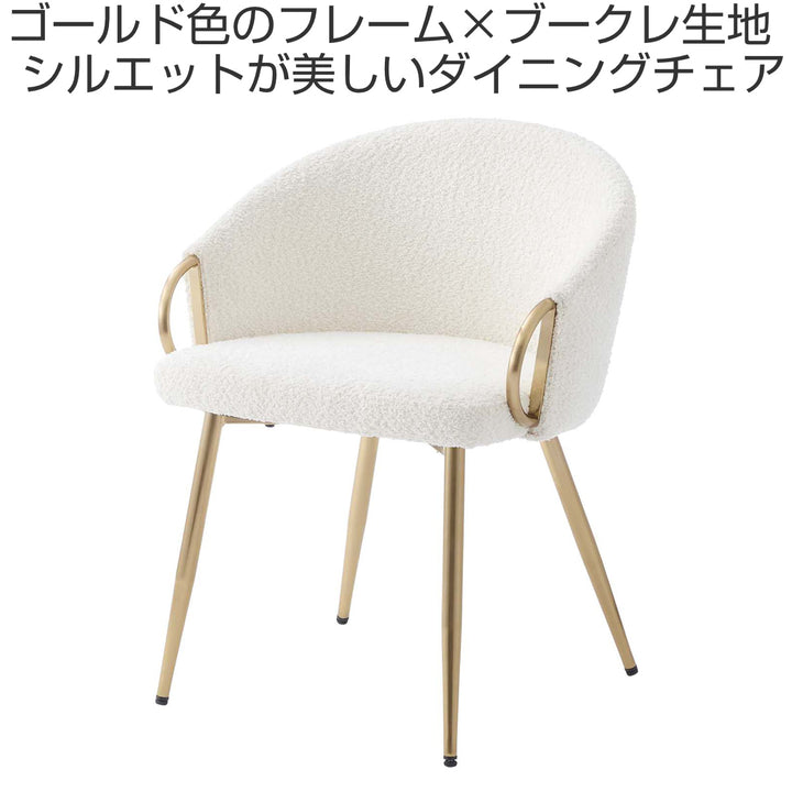 艶のあるゴールド脚と背面まで覆ったブークレ生地の組み合わせが上品なダイニングチェア。どの角度から見ても美しいフォルムは、空間を彩ります。ダイニングチェアとしてはもちろん、寝室やサロンの待合など、様々なシーンでお使い頂けます。