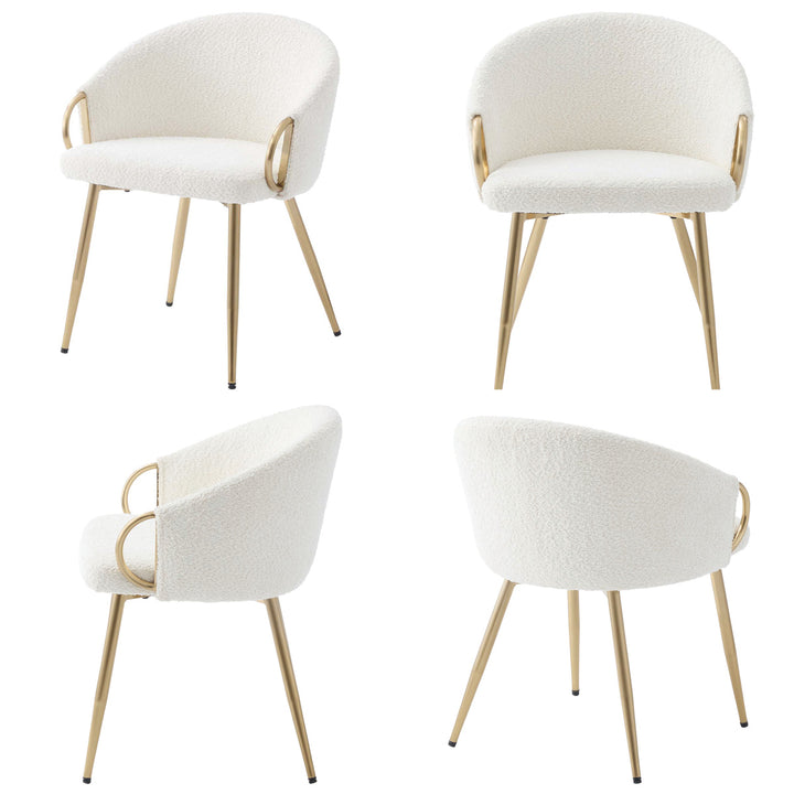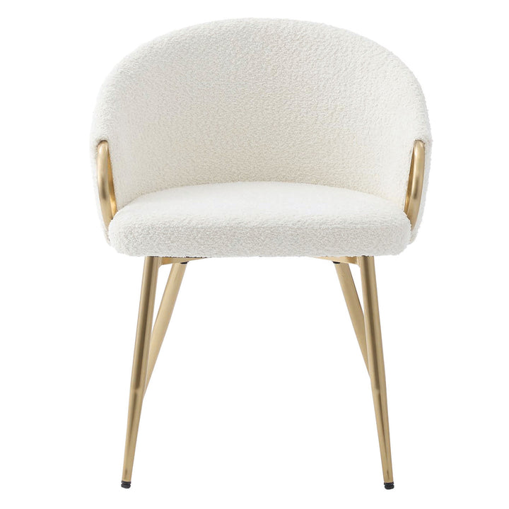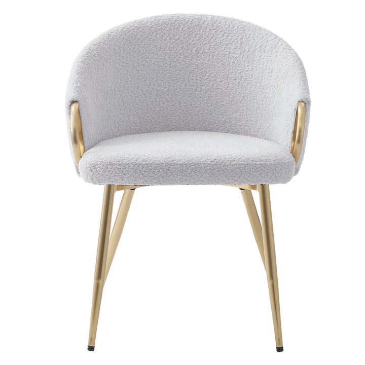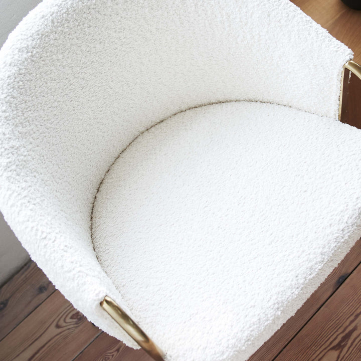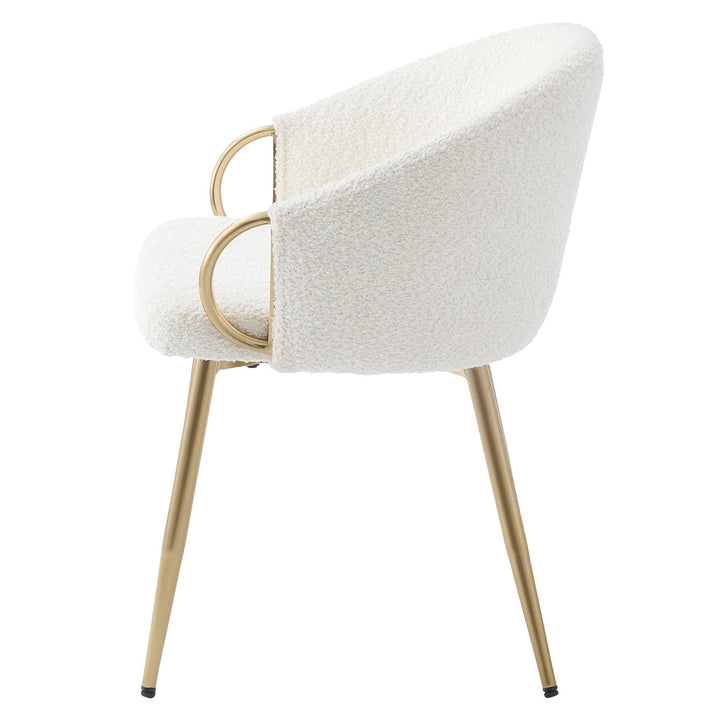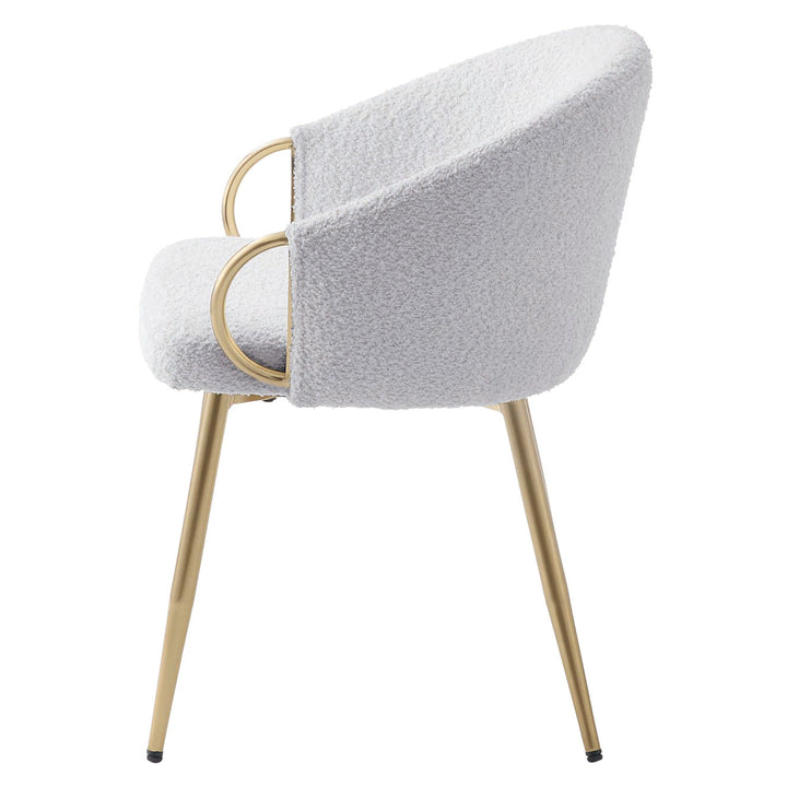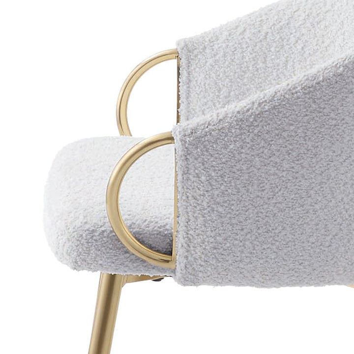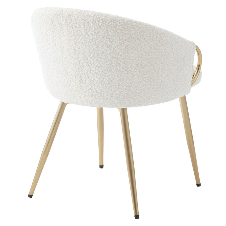 艶のあるゴールド脚と背面まで覆ったブークレ生地の組み合わせが上品なダイニングチェア。どの角度から見ても美しいフォルムは、空間を彩ります。ダイニングチェアとしてはもちろん、寝室やサロンの待合など、様々なシーンでお使い頂けます。