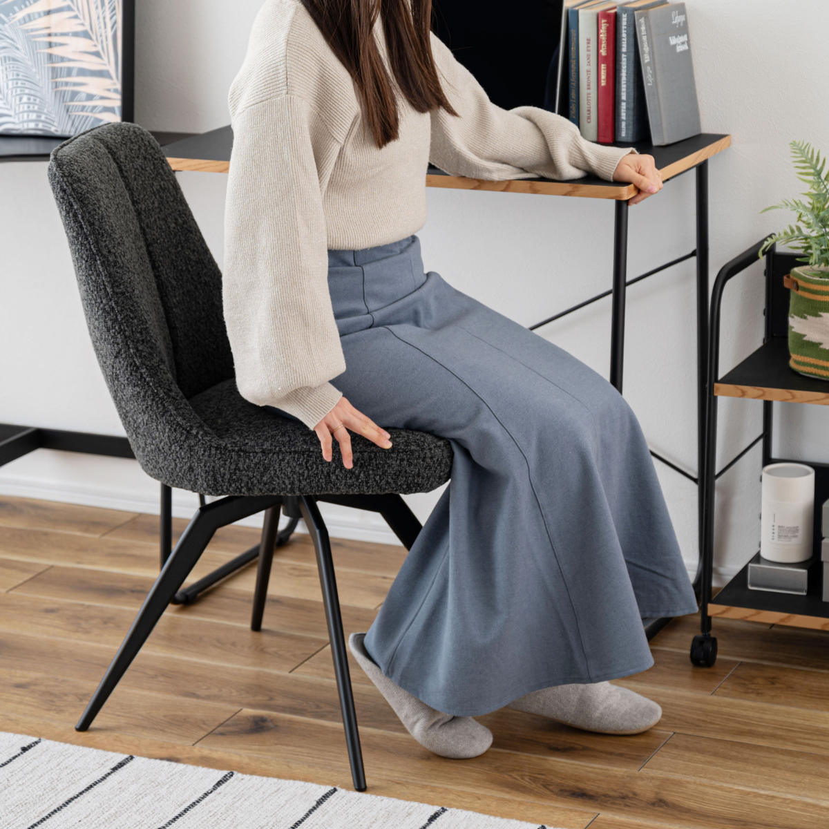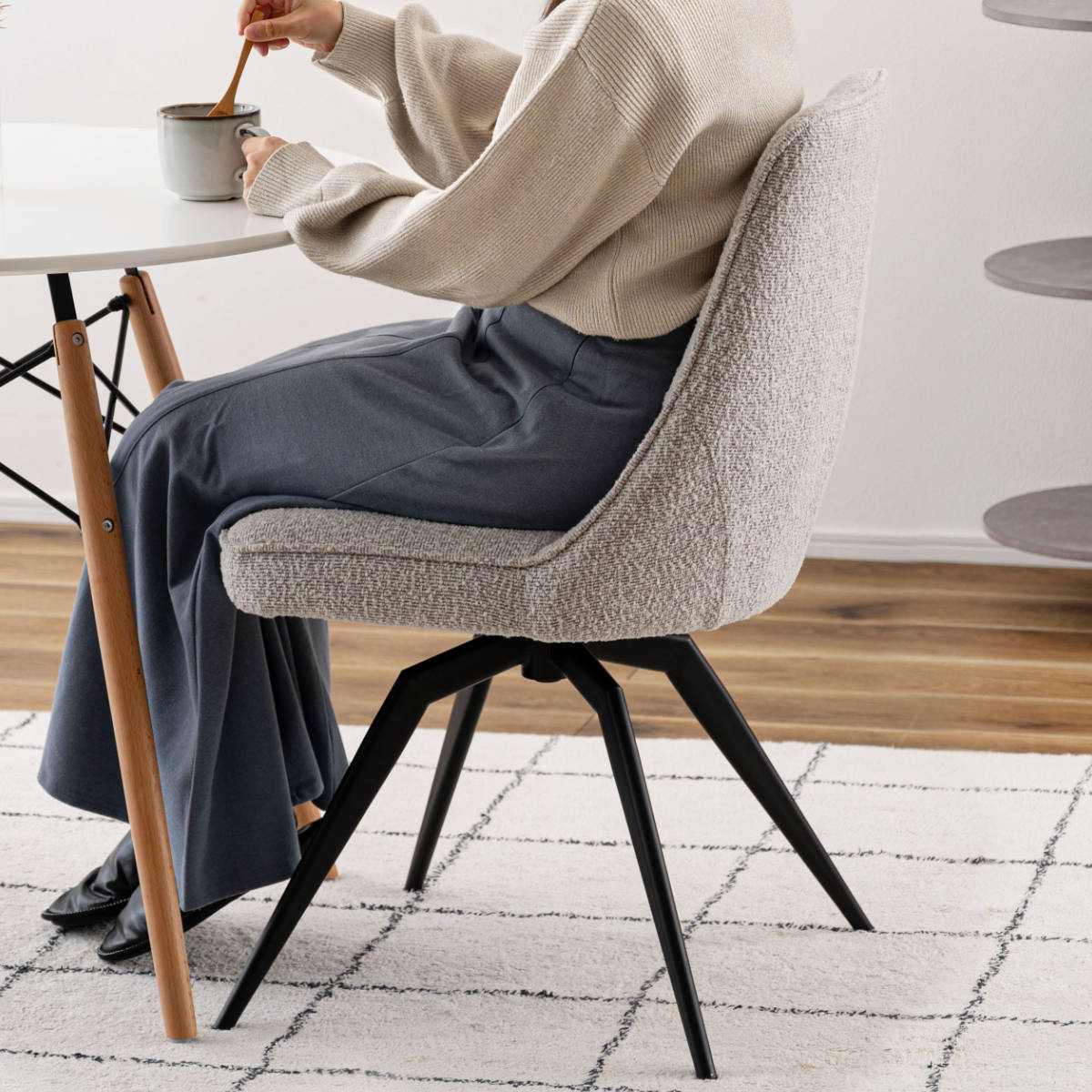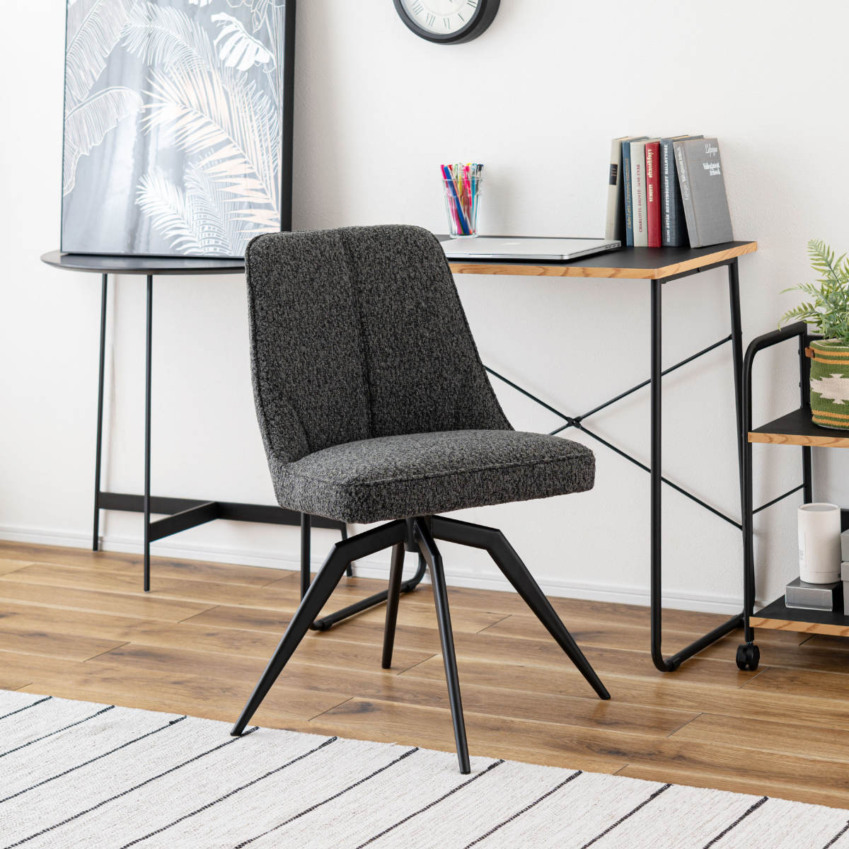 ダイニングシーンのみならず、在宅ワークや学習時のデスクチェアとしても活用できます。回転チェアで前にも横にもくるっと向きを変えられるので、近くの物も立ち上がらずに手を伸ばせて作業効率アップに繋がります。