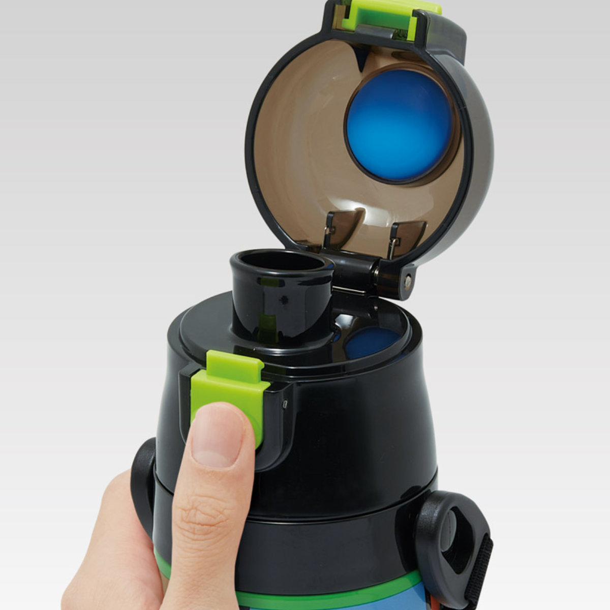 水筒の蓋はボタンを押すだけで開けることができるワンタッチ式です。飲み終わったら蓋をカチッと閉めるだけなので、小さなお子様でも簡単に開閉できます。