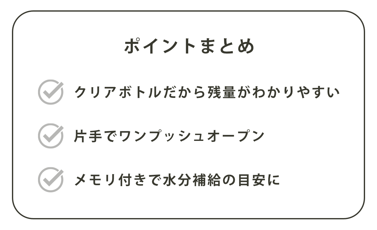1回の給水で100mlのメモリ付きで、飲んだ量がひと目でわかりやすく、時間を目安に効果的に水分補給が出来ます。