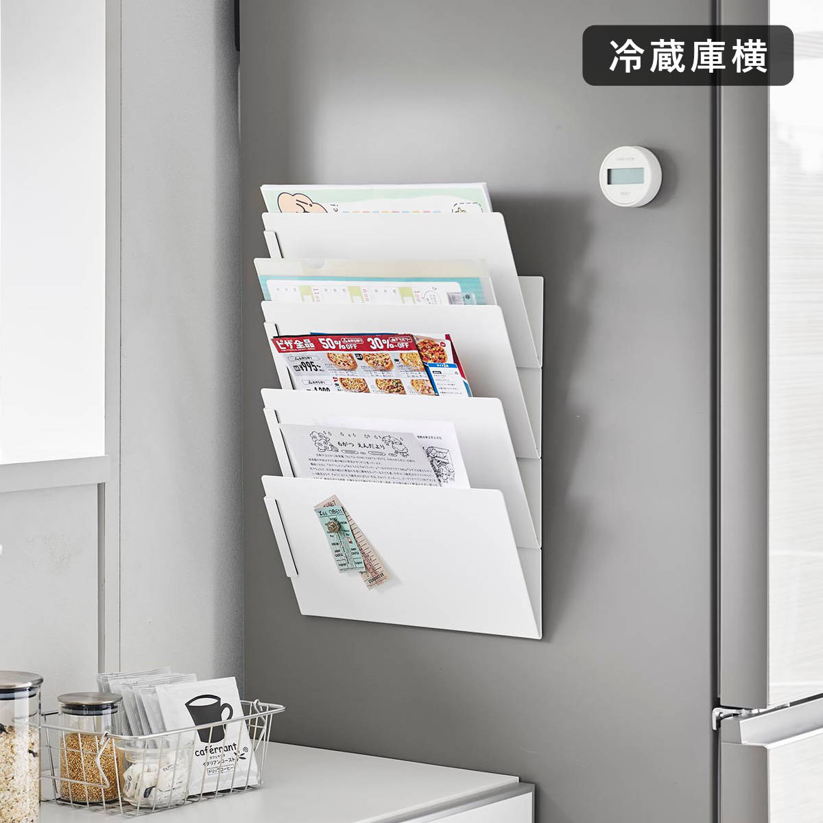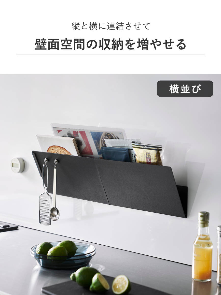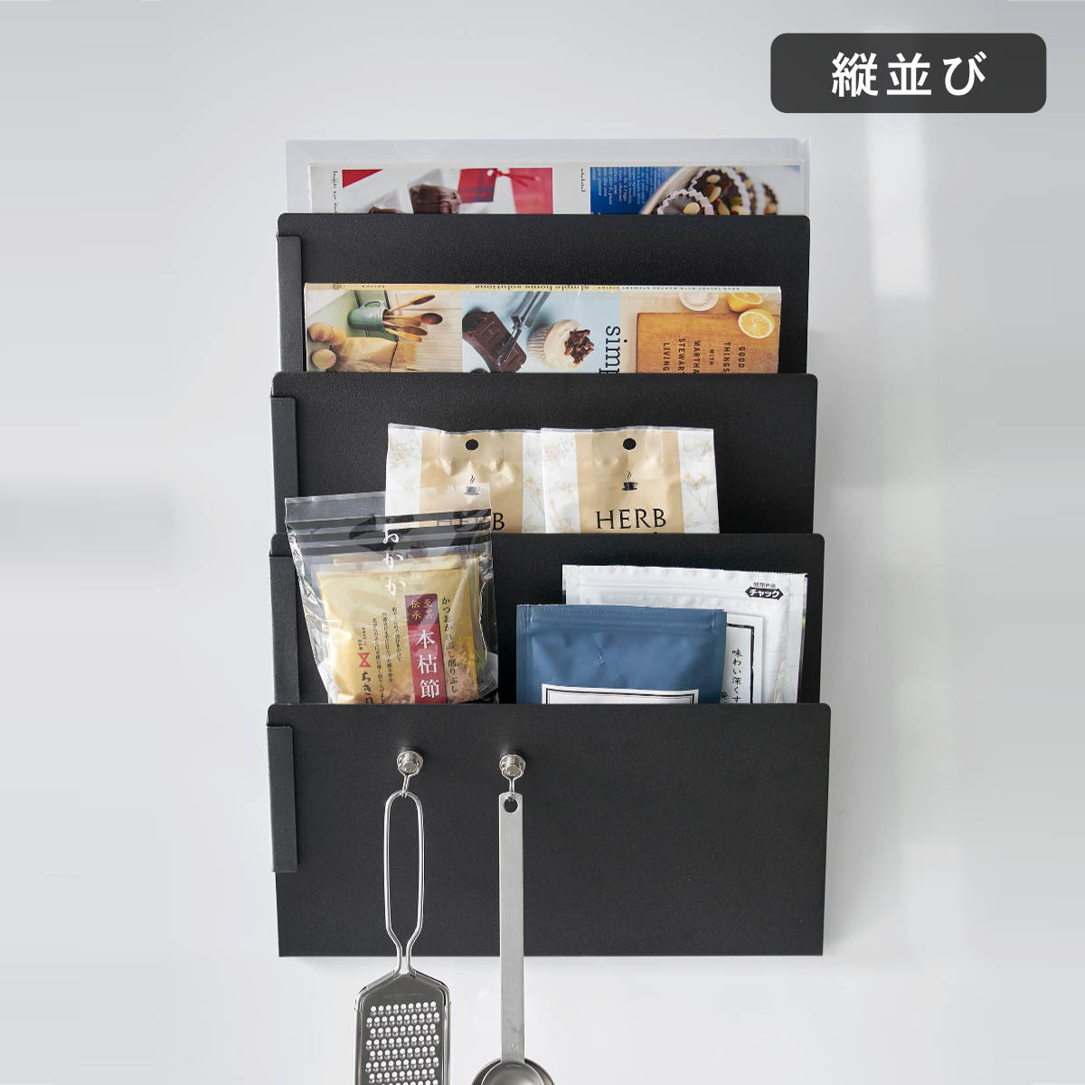 レシピ本やデリバリーのチラシ、学校のプリント類などの書類を収納したり、お料理に使う出汁パックや紅茶のティーパックを見えるように立てて収納できます。