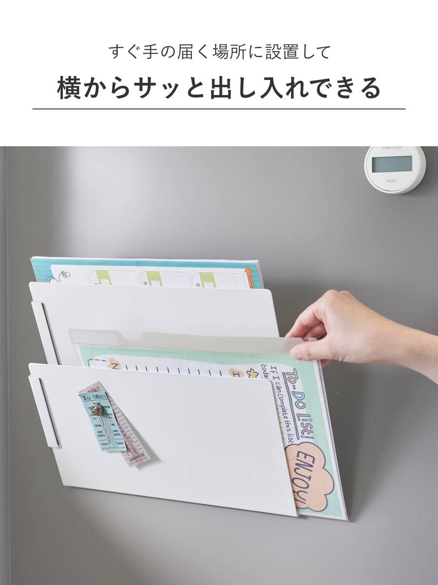書類やプリントの出し入れしたい方の反対側にストッパーを取り付けることで、滑り落ちるのを塞いでくれます。