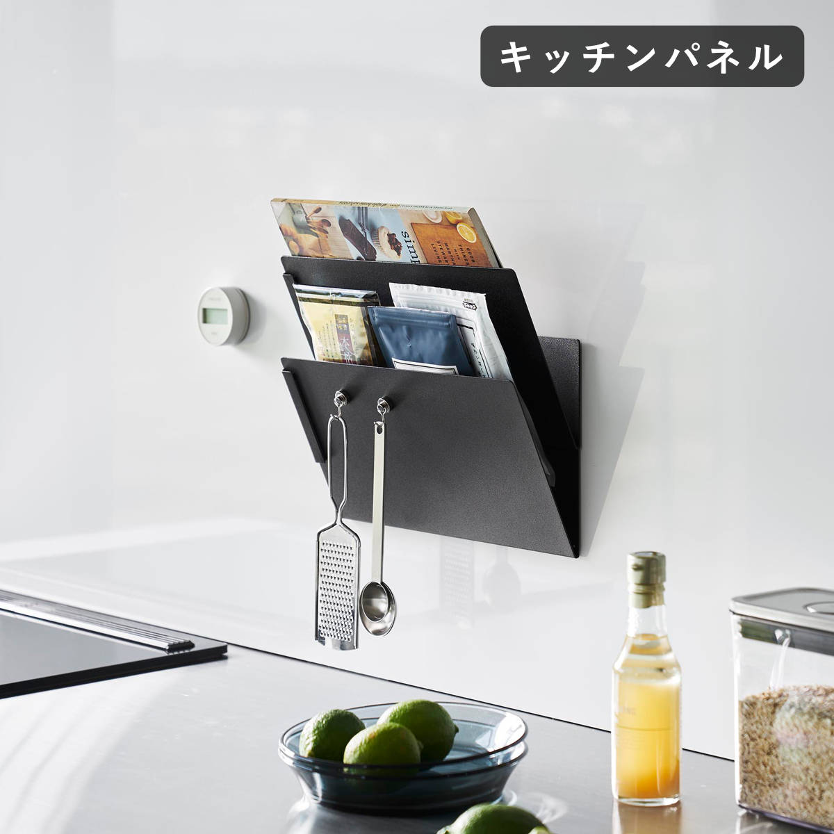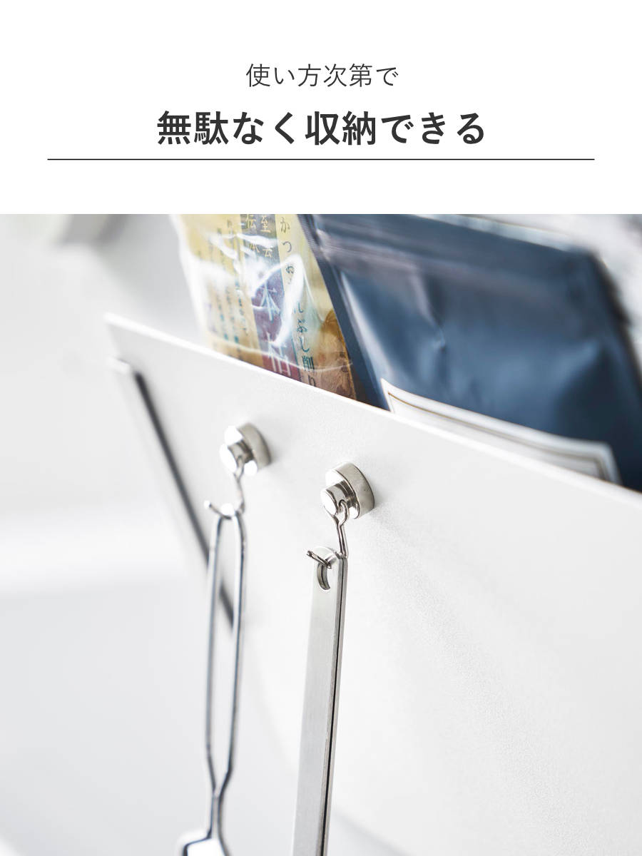 マグネットが付くのでキッチンアイテムを吊り下げたり、レシートやプリント類を貼ることもできます。ラックの中だけでなく、外側のパネル部分も収納場所として無駄なく使えます。