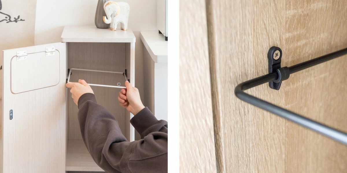 天板がフラットになっているため、キッチン雑貨や観葉植物、ディフューザーなどのちょっとした小物が置けます。天板や扉の角はケガをしないように丸く加工されているので、安心安全です。