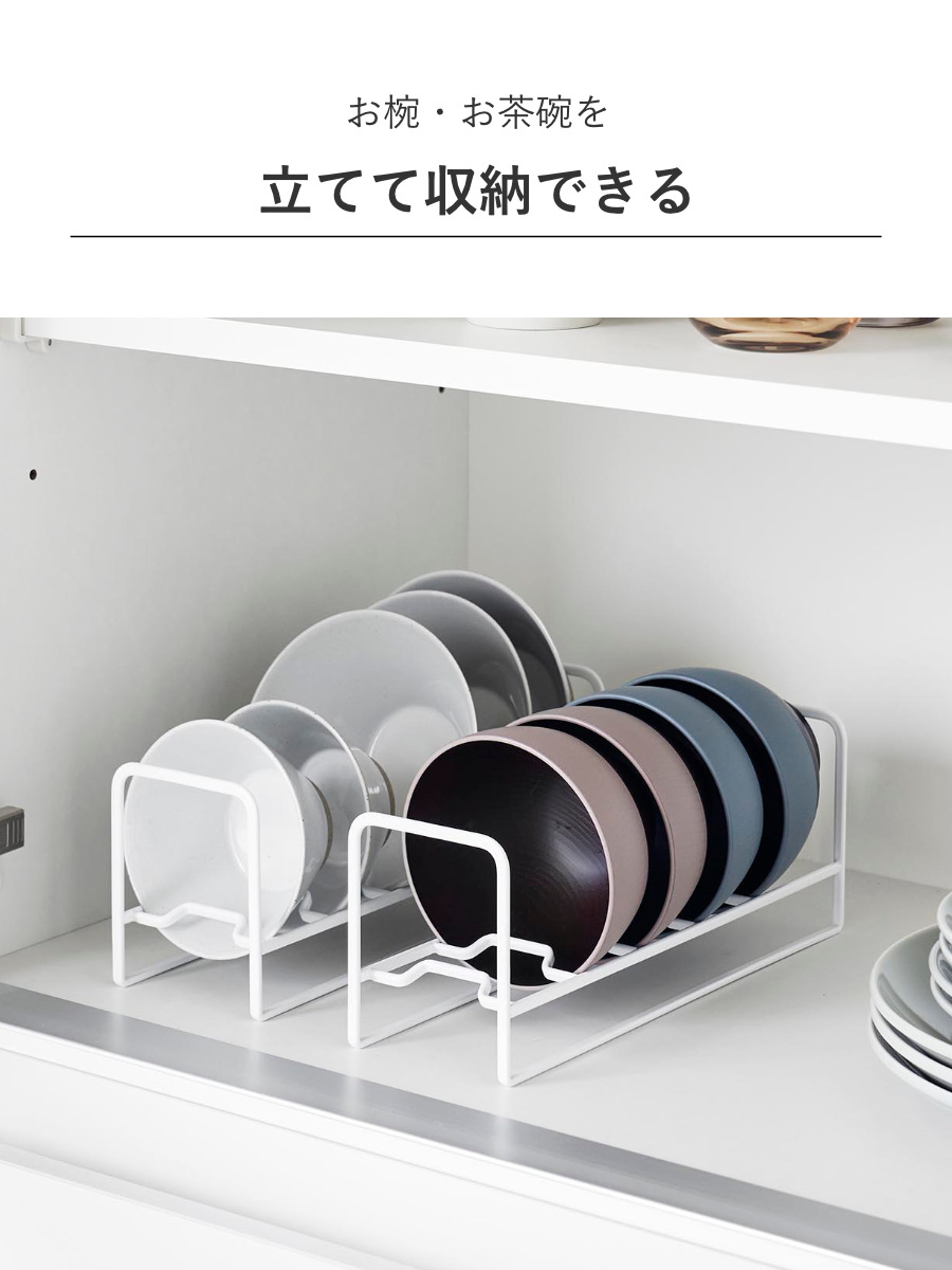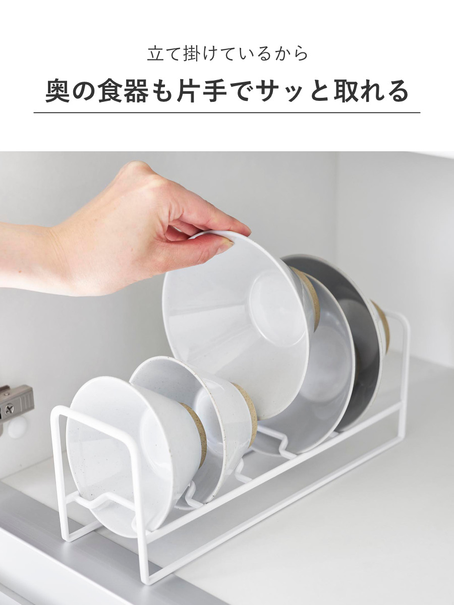 お椀やお茶碗を5つまで収納できるお皿スタンドです。積み重ねずに並べて収納することで、選びやすく取り出しやすいです。