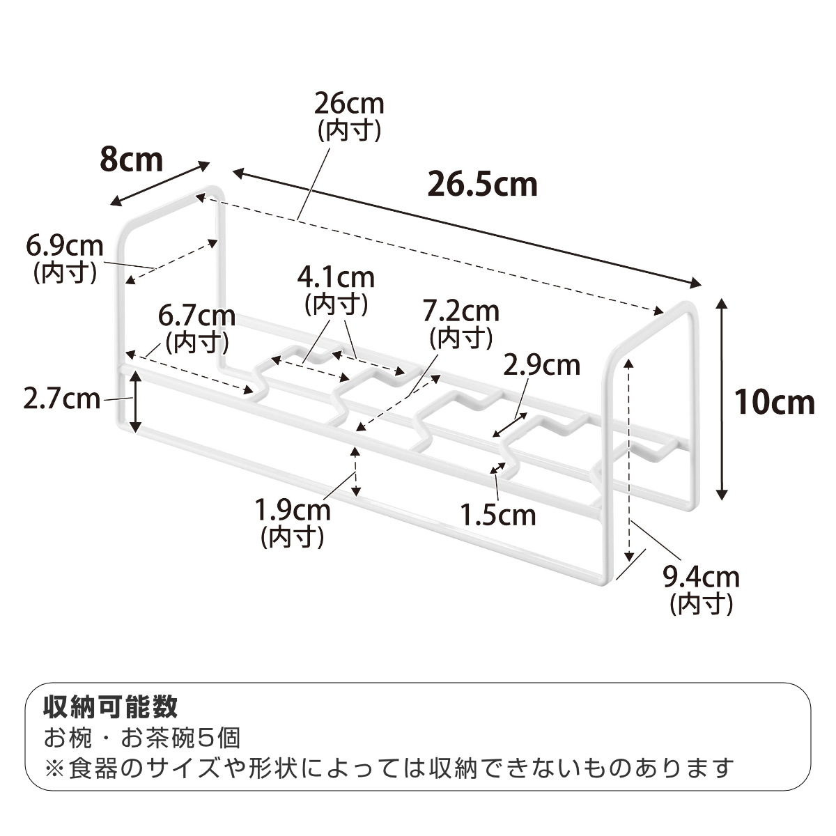 | 備考 | お椀・お茶碗5個(お椀・お茶碗の形状により異なります) ※食器のサイズや形状によっては収納できない物もあります。 |