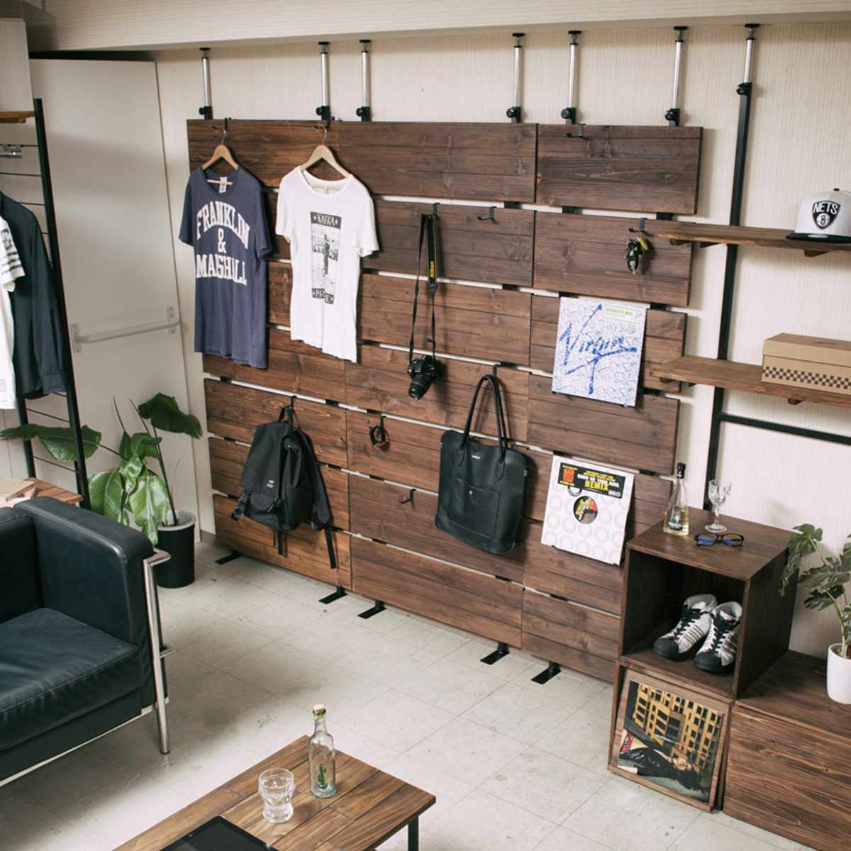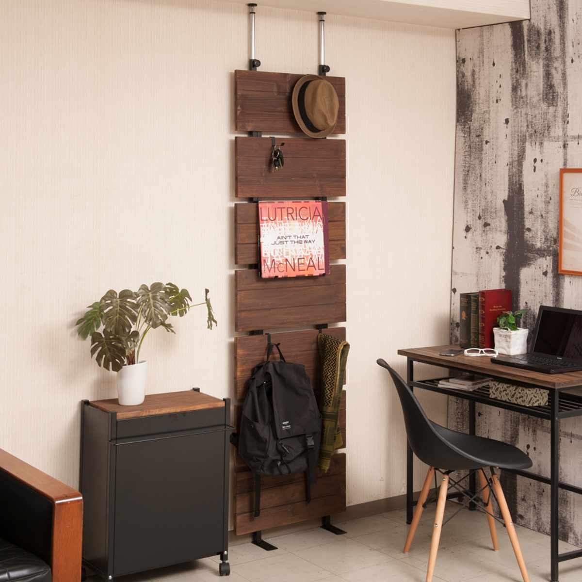 壁面収納ができる、突っ張り式のウォールパーテーションです。ヴィンテージ感漂うデザインで、見せる収納として服や小物、趣味の物などをお洒落に飾っていただけます。天井からの突っ張り式で、壁に穴を開ける必要がないので、賃貸にお住まいの方でも安心してご使用いただけます。